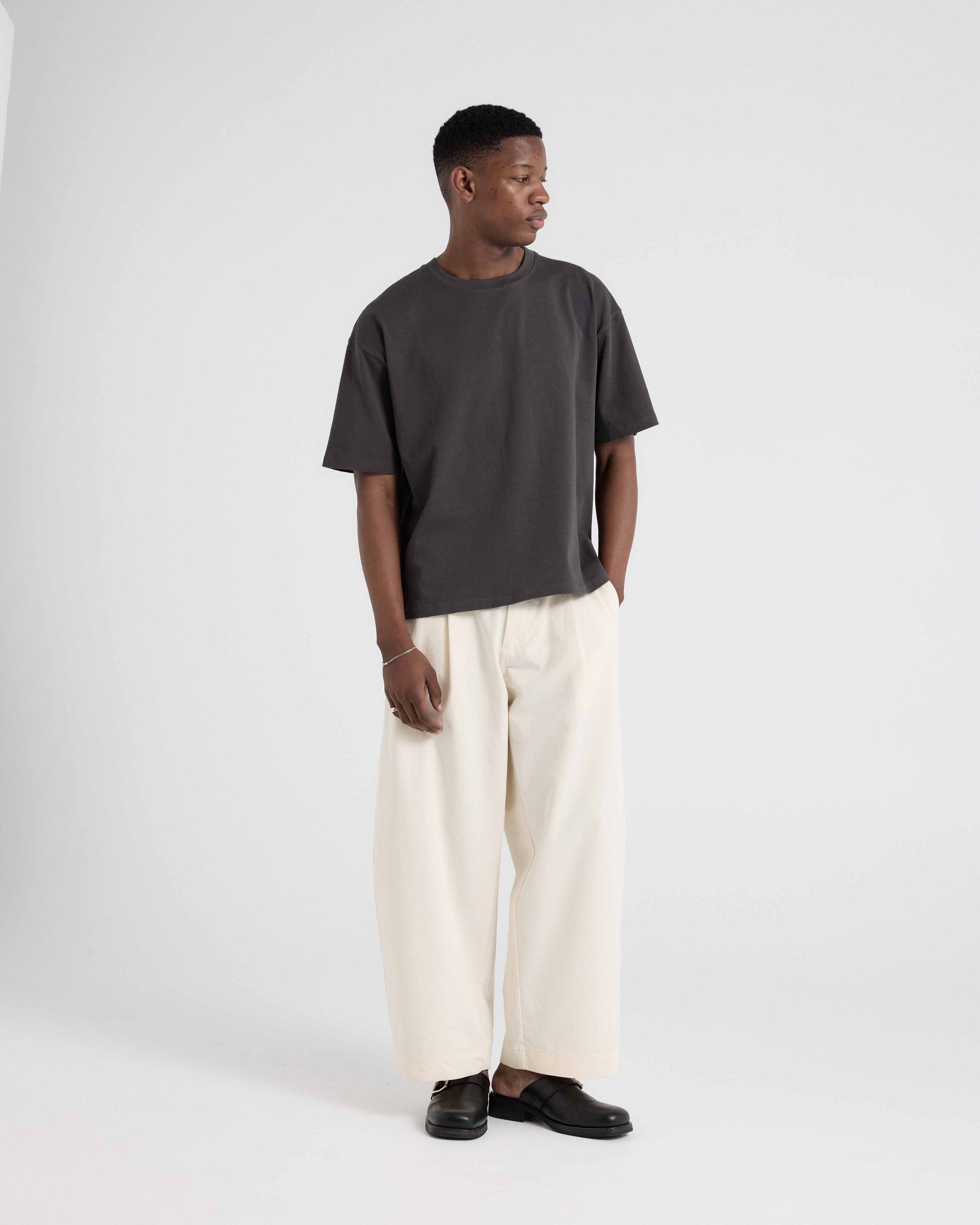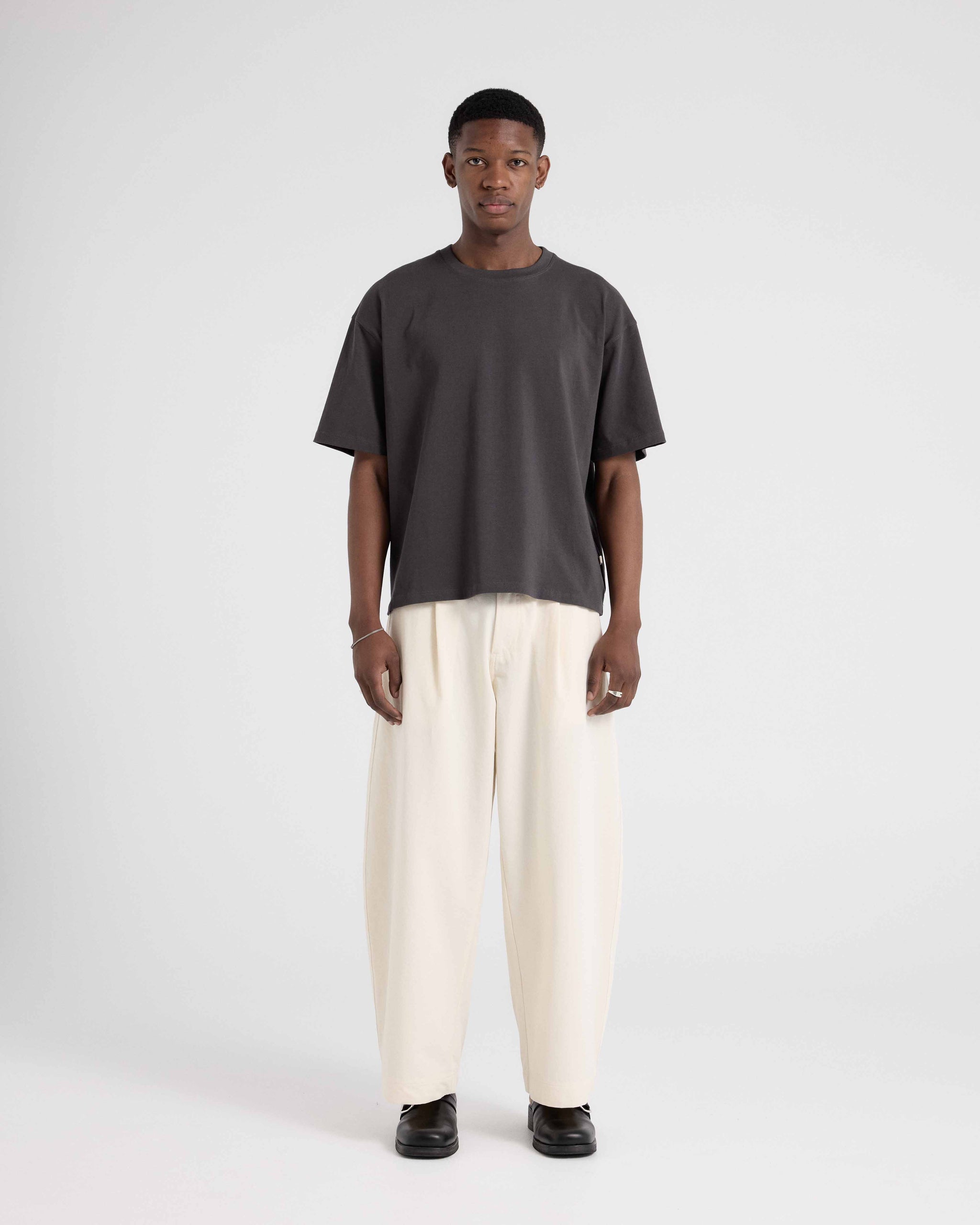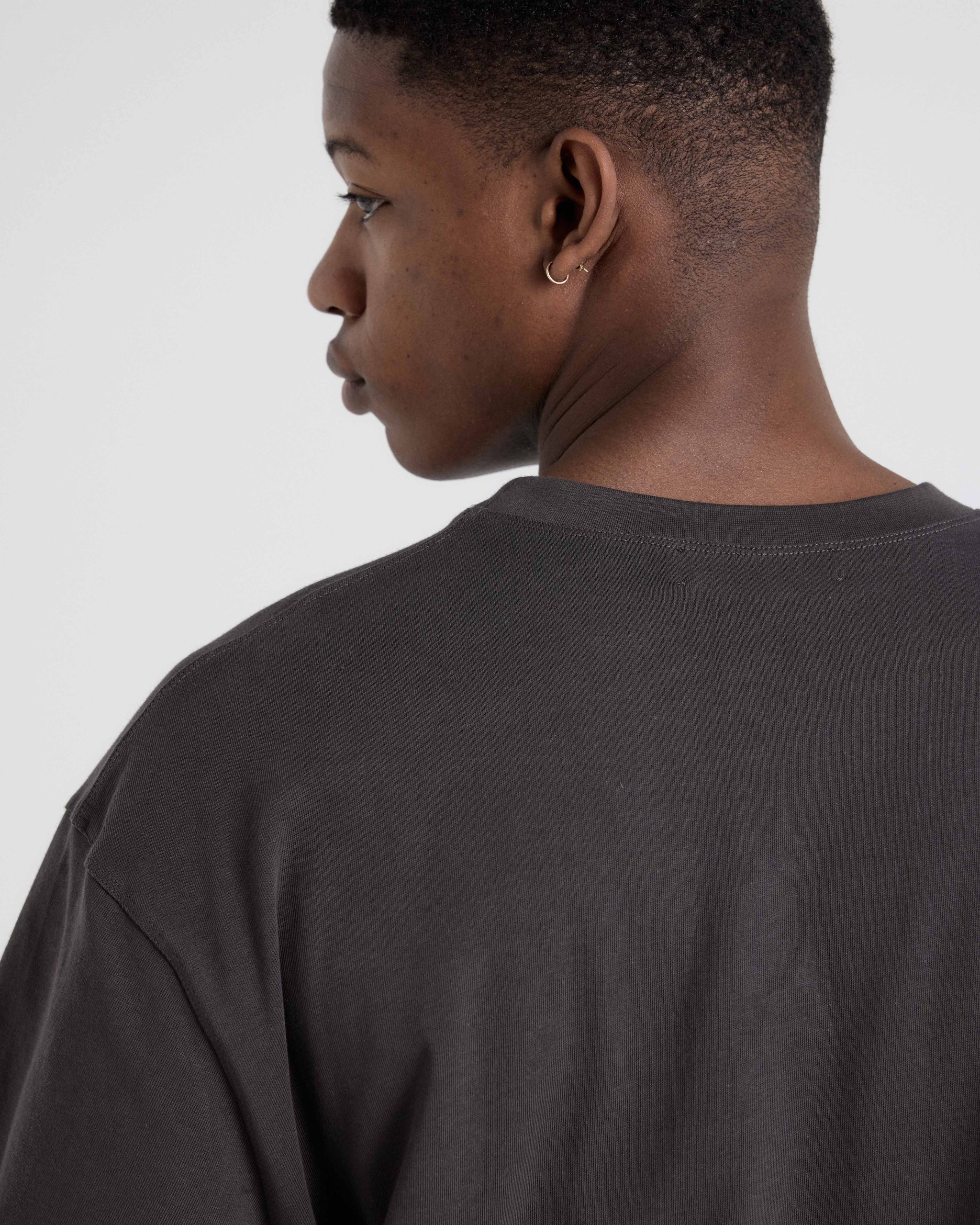 Our Essential T-Shirt is cut from 220gsm 100% Good Earth Cotton® jersey, treated for a soft touch feel. Designed with relaxed shoulders, a wide body and a waistline finish for a boxy fit.