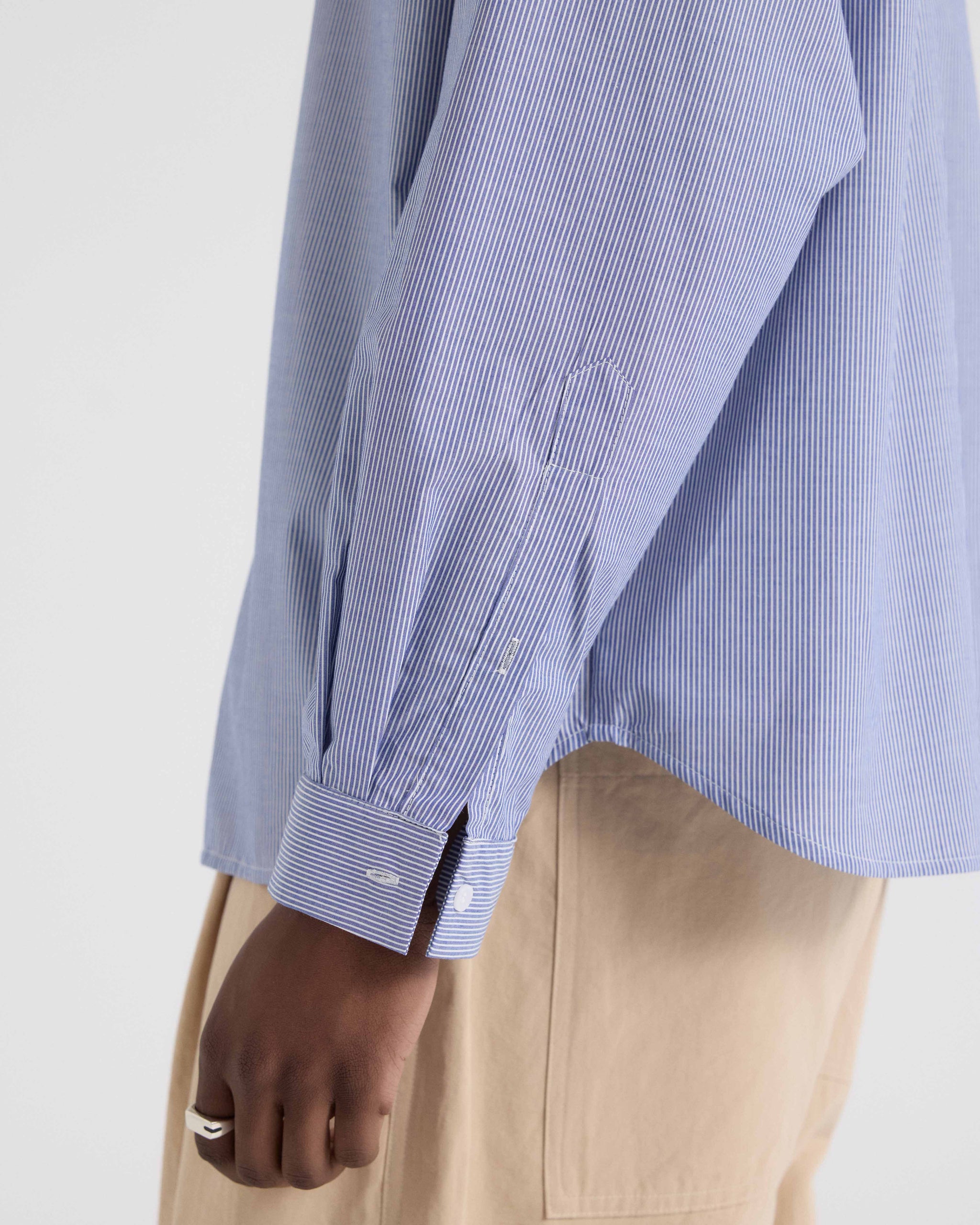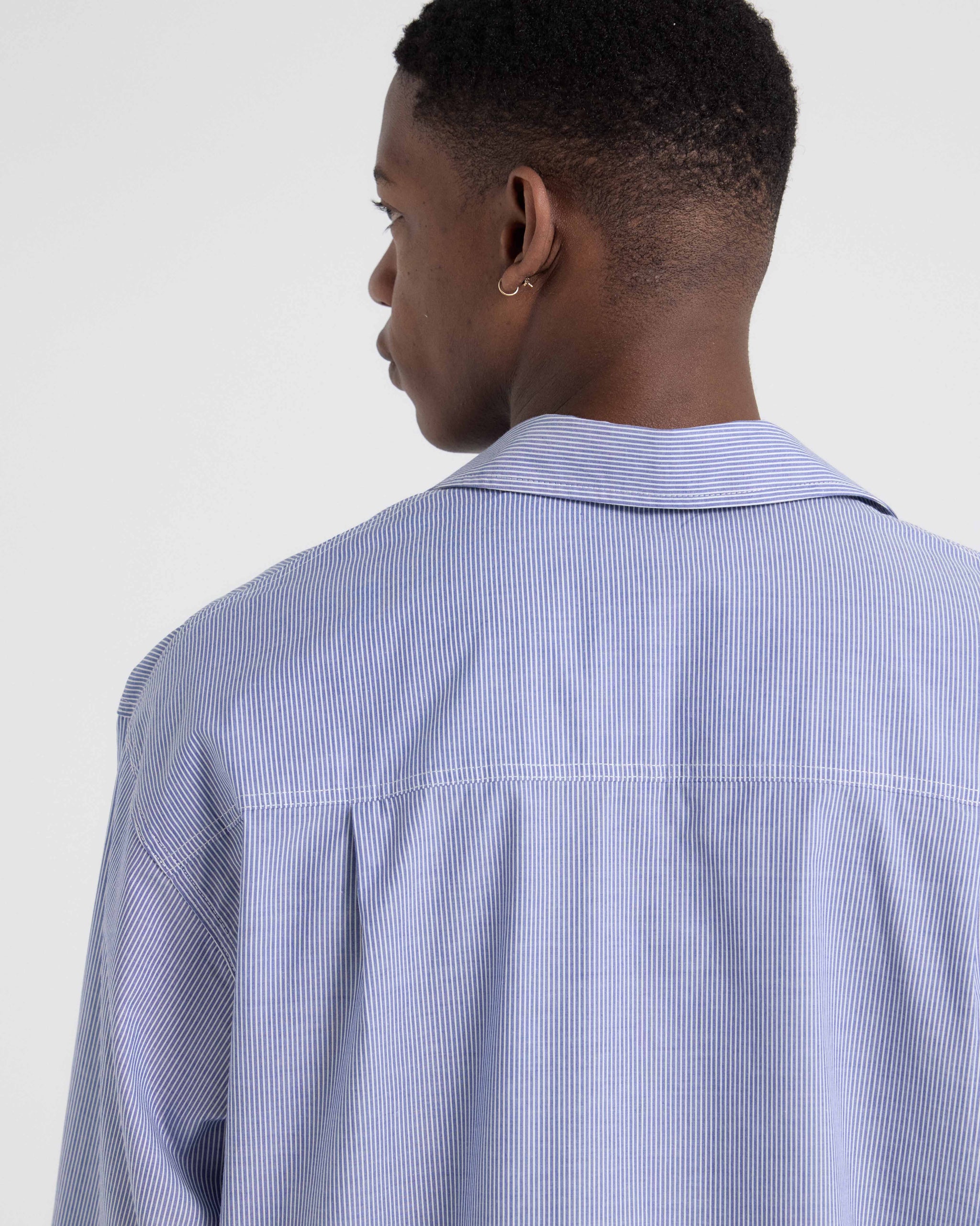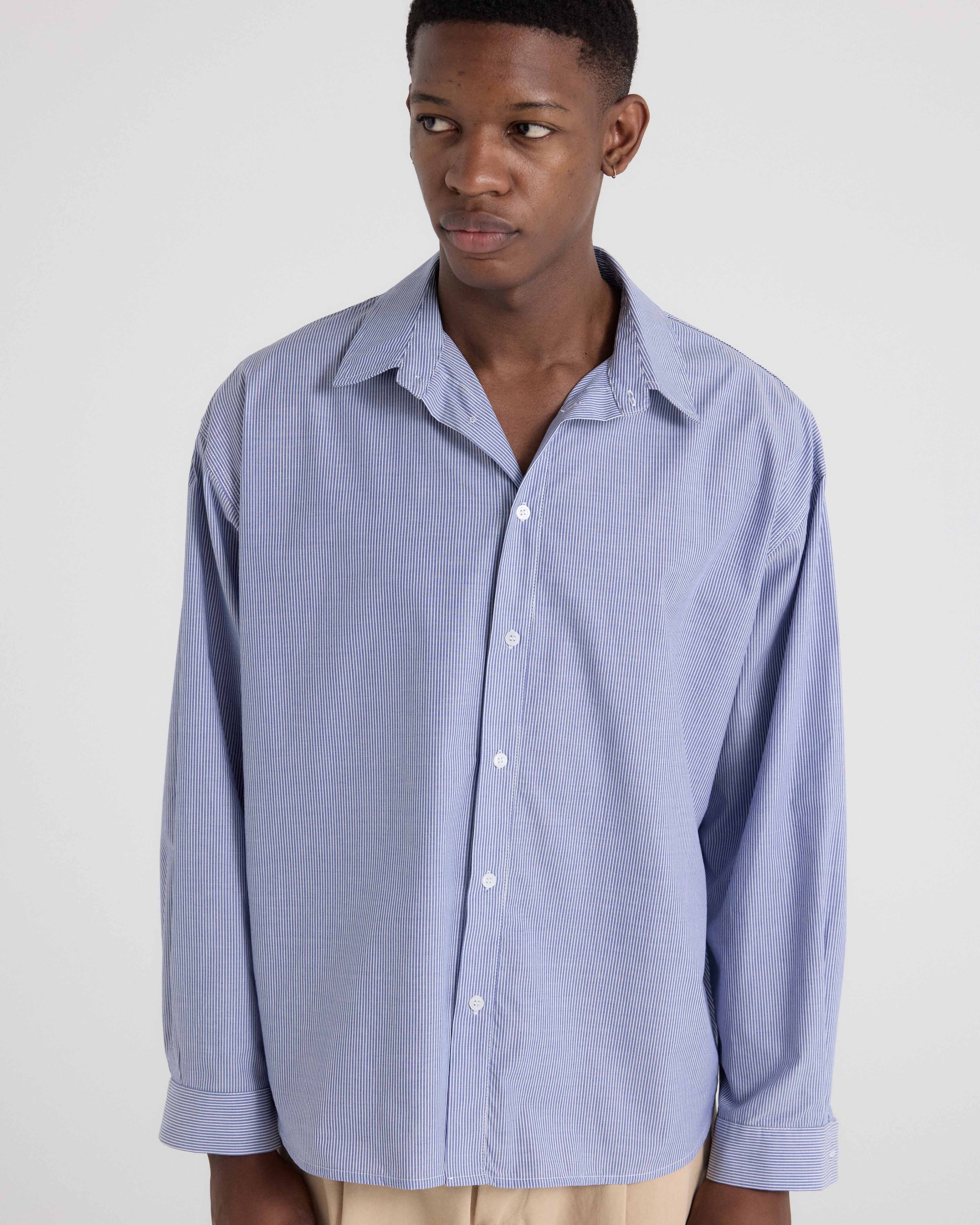 Our take on a classic business shirt. The Executive Shirt is designed with drop shoulders and a curved hemline that finishes at the waist for an overall loose fitting silhouette. Cut from a lightweight cotton with a blue/white strip.