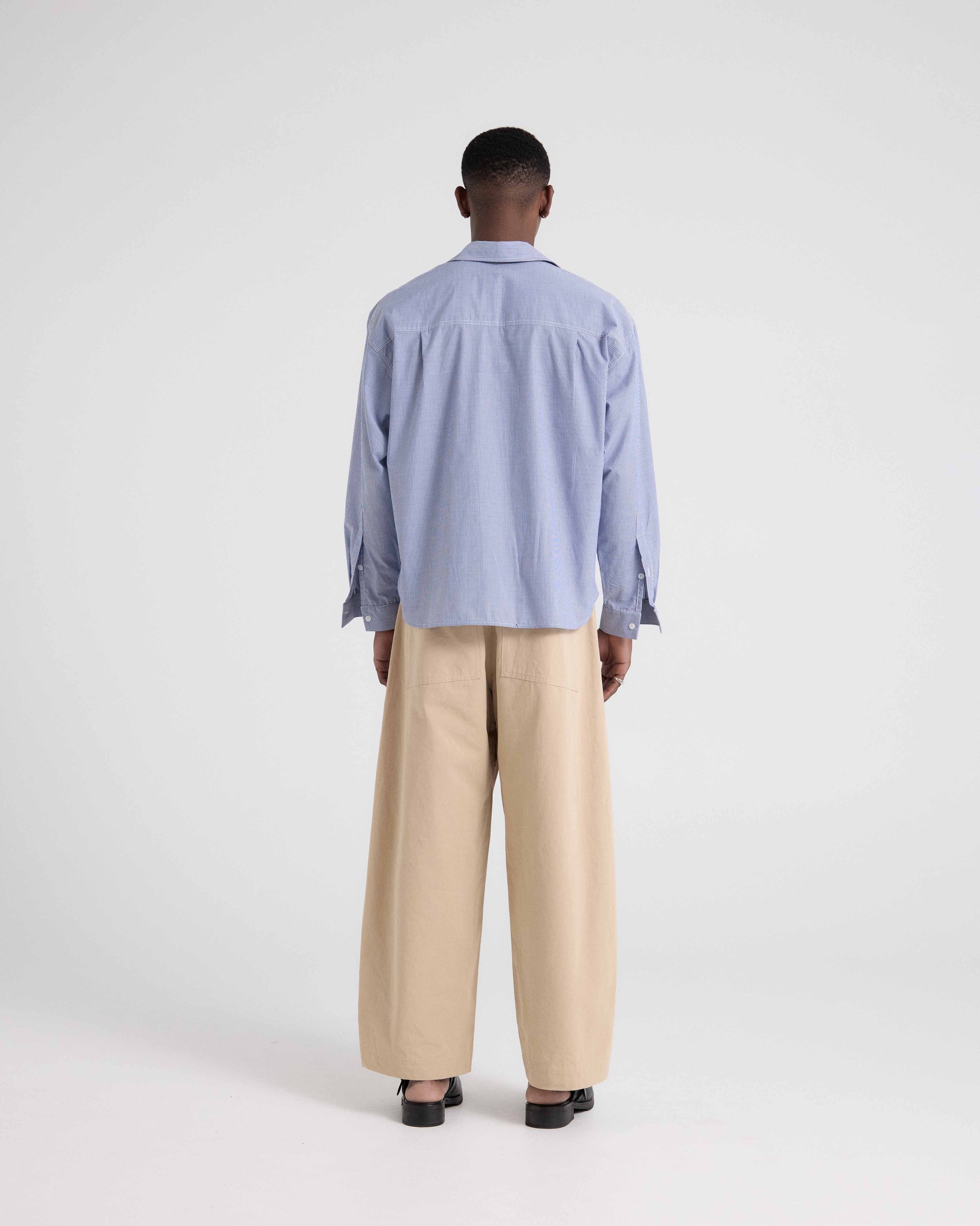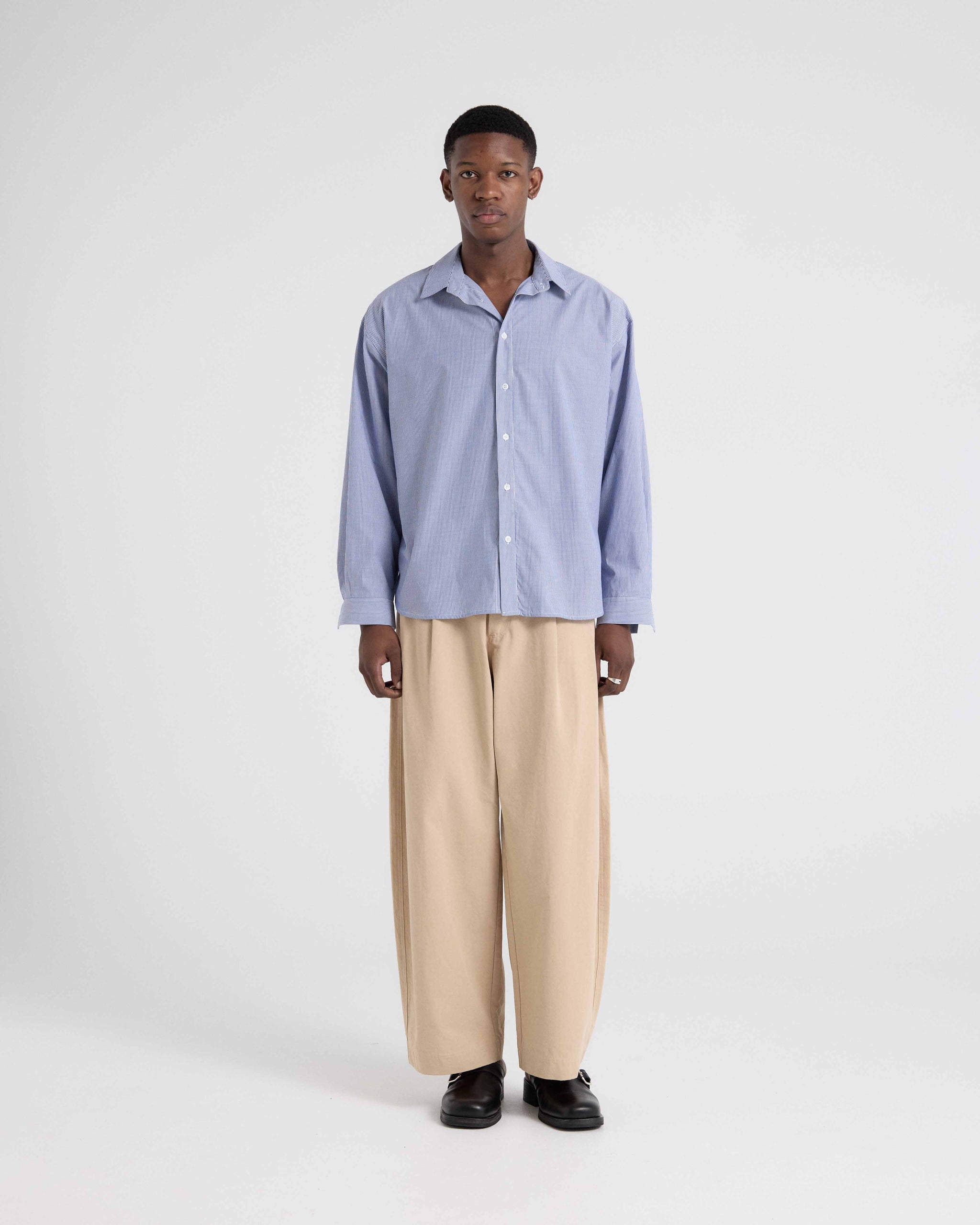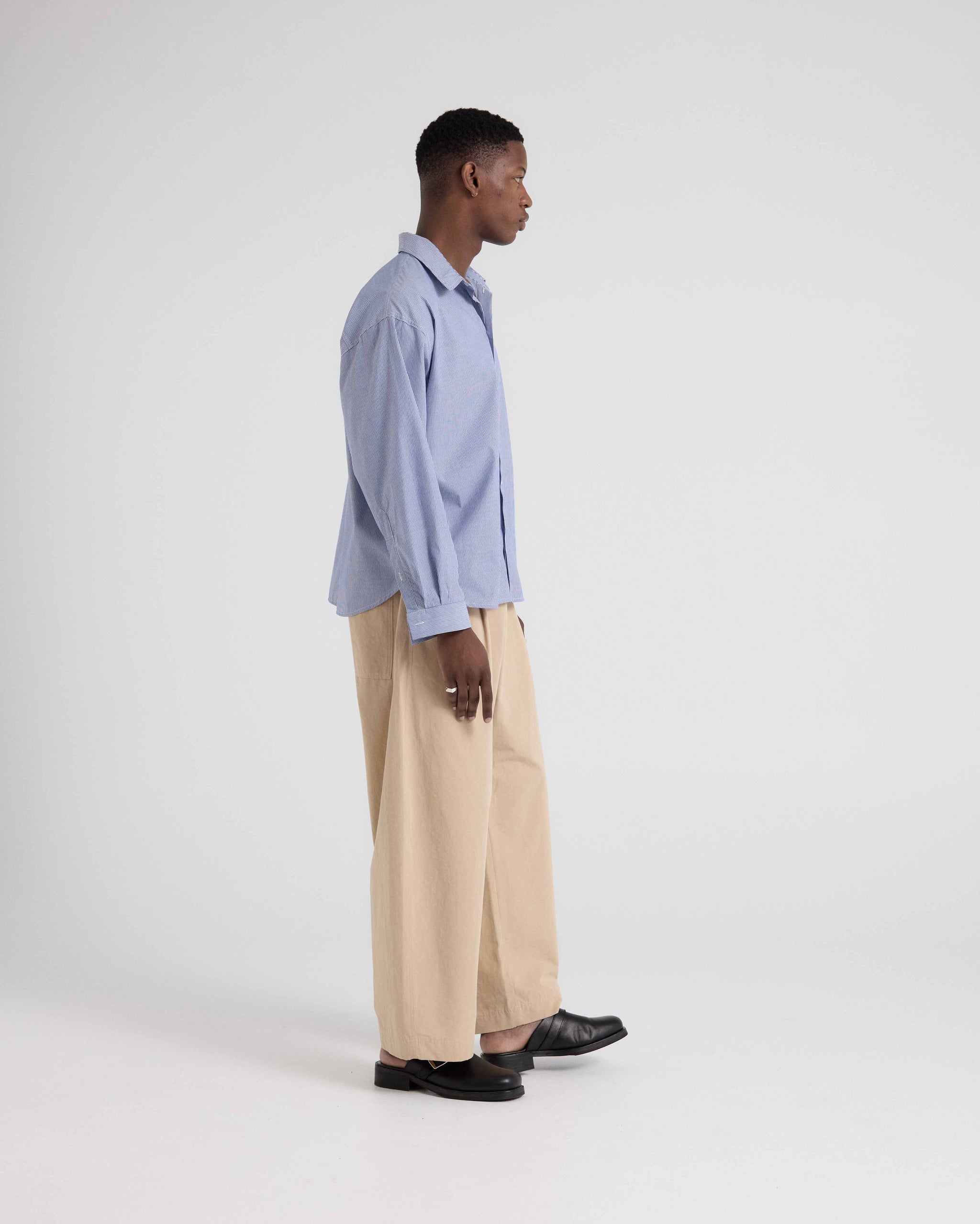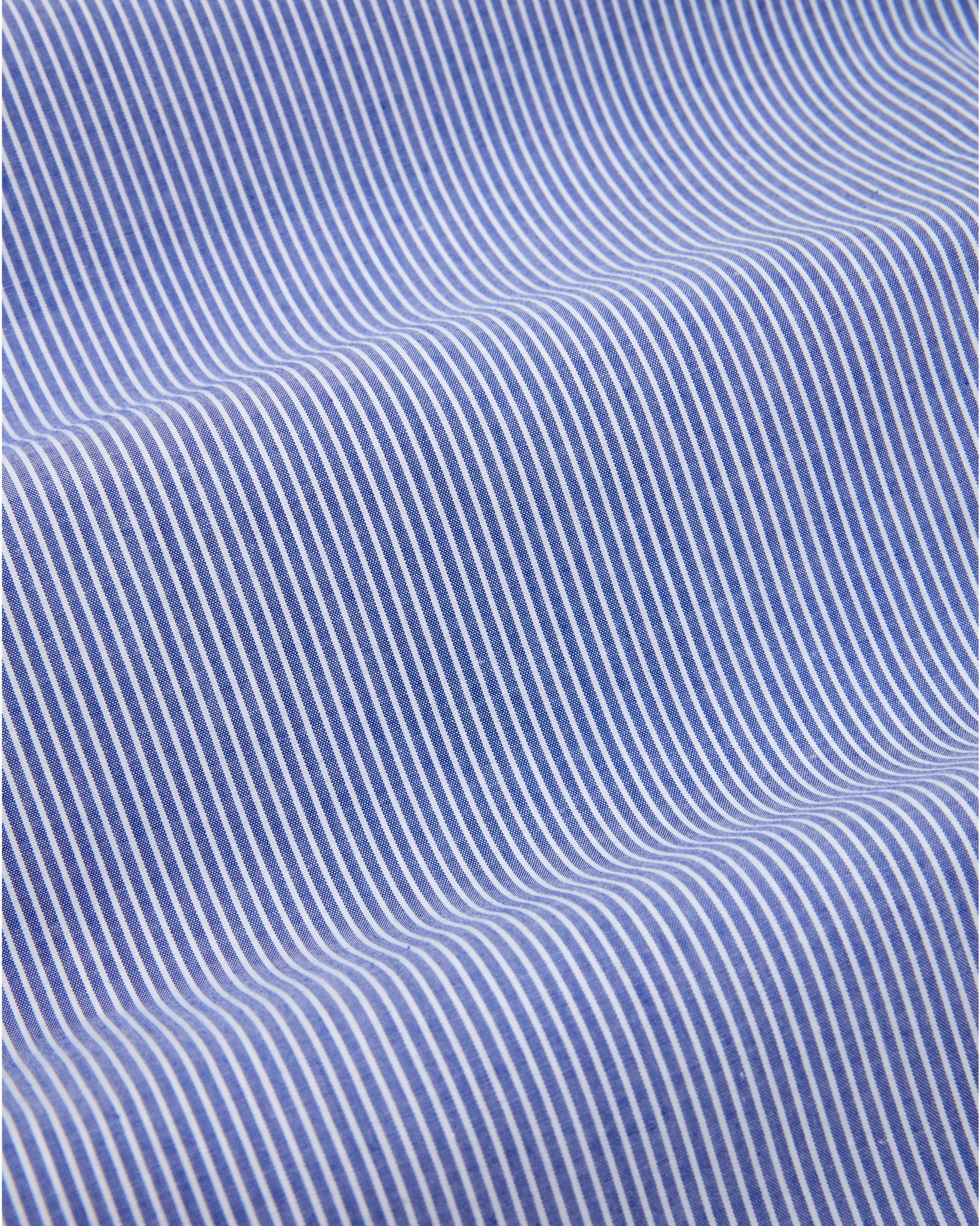 Our take on a classic business shirt. The Executive Shirt is designed with drop shoulders and a curved hemline that finishes at the waist for an overall loose fitting silhouette. Cut from a lightweight cotton with a blue/white strip.