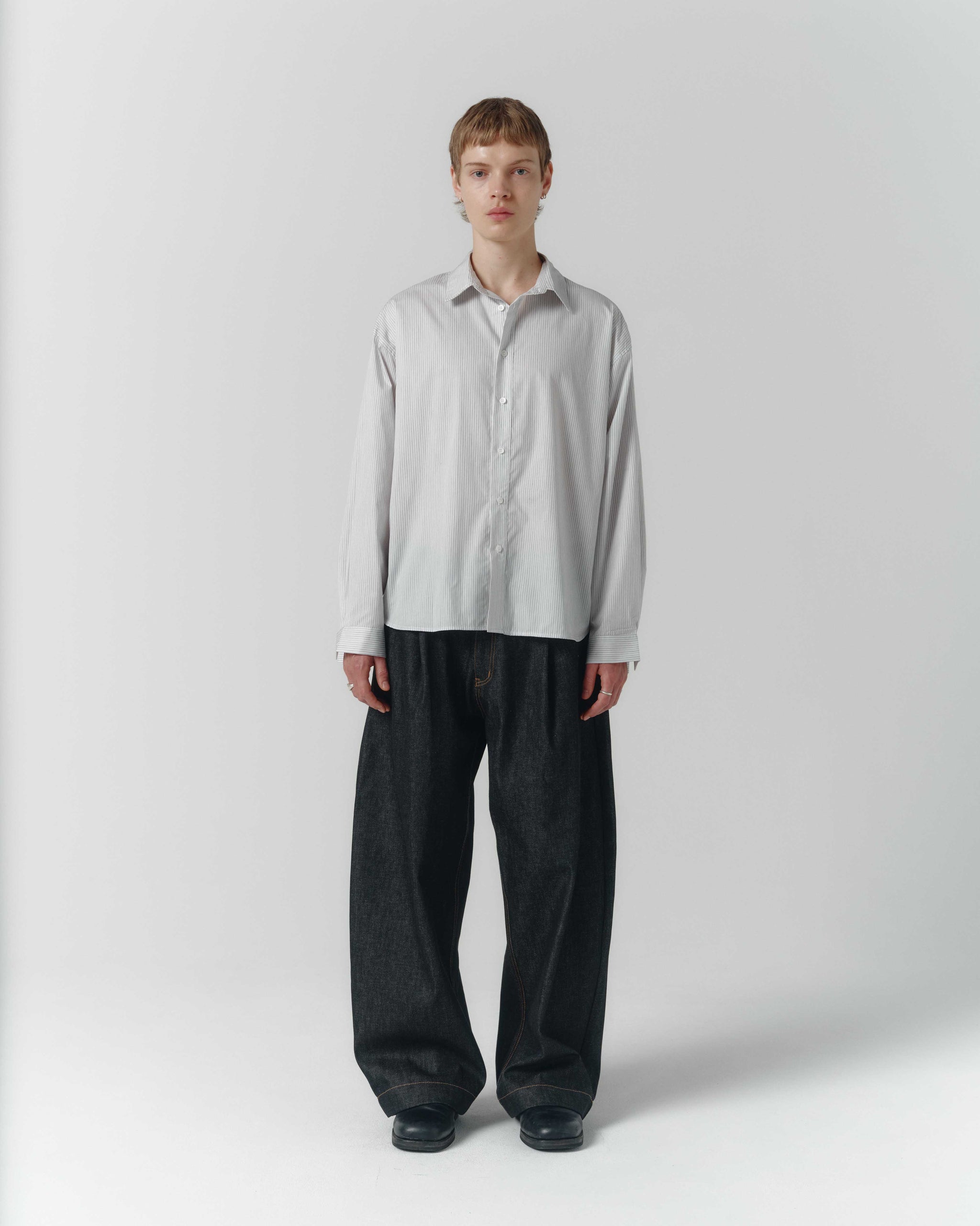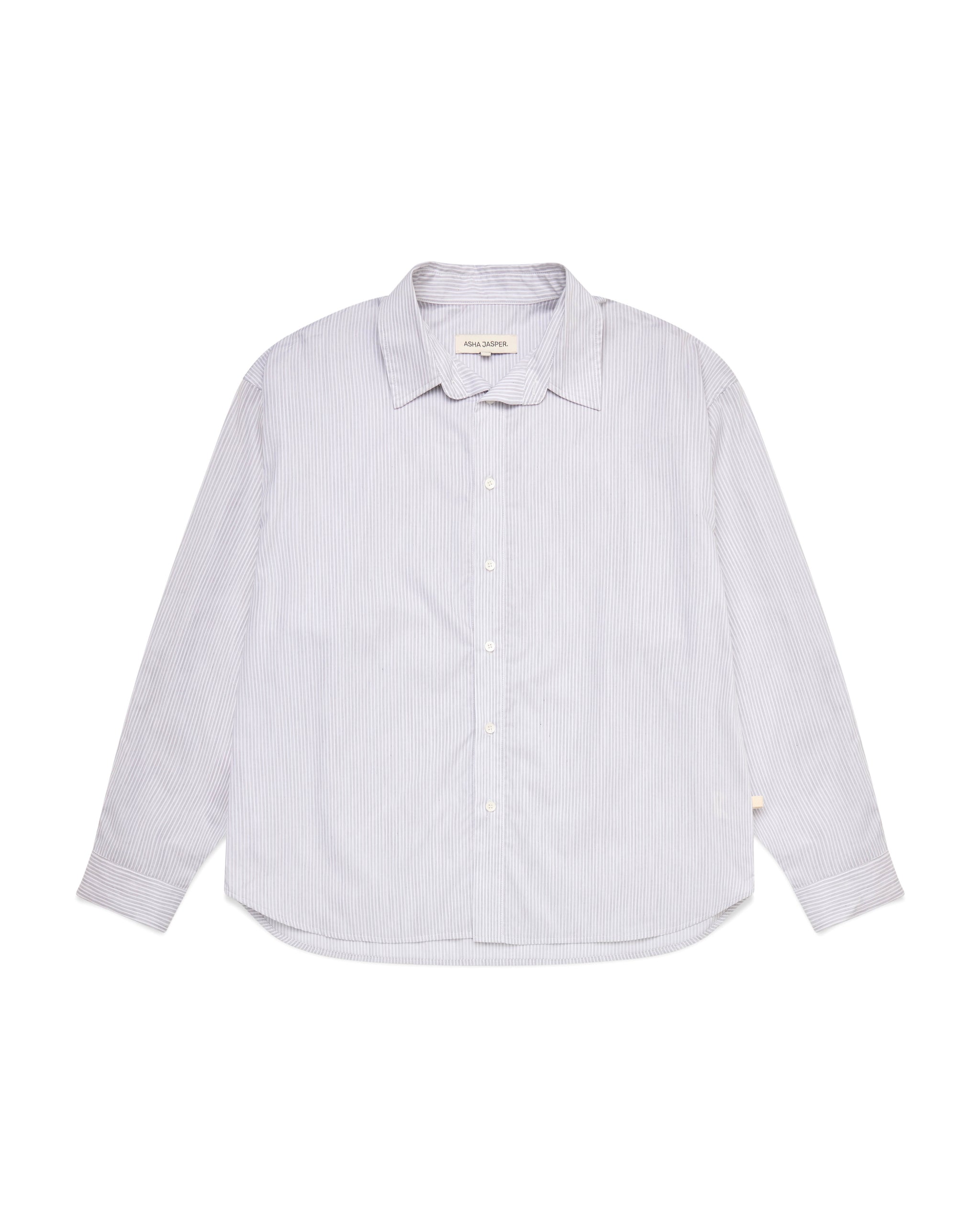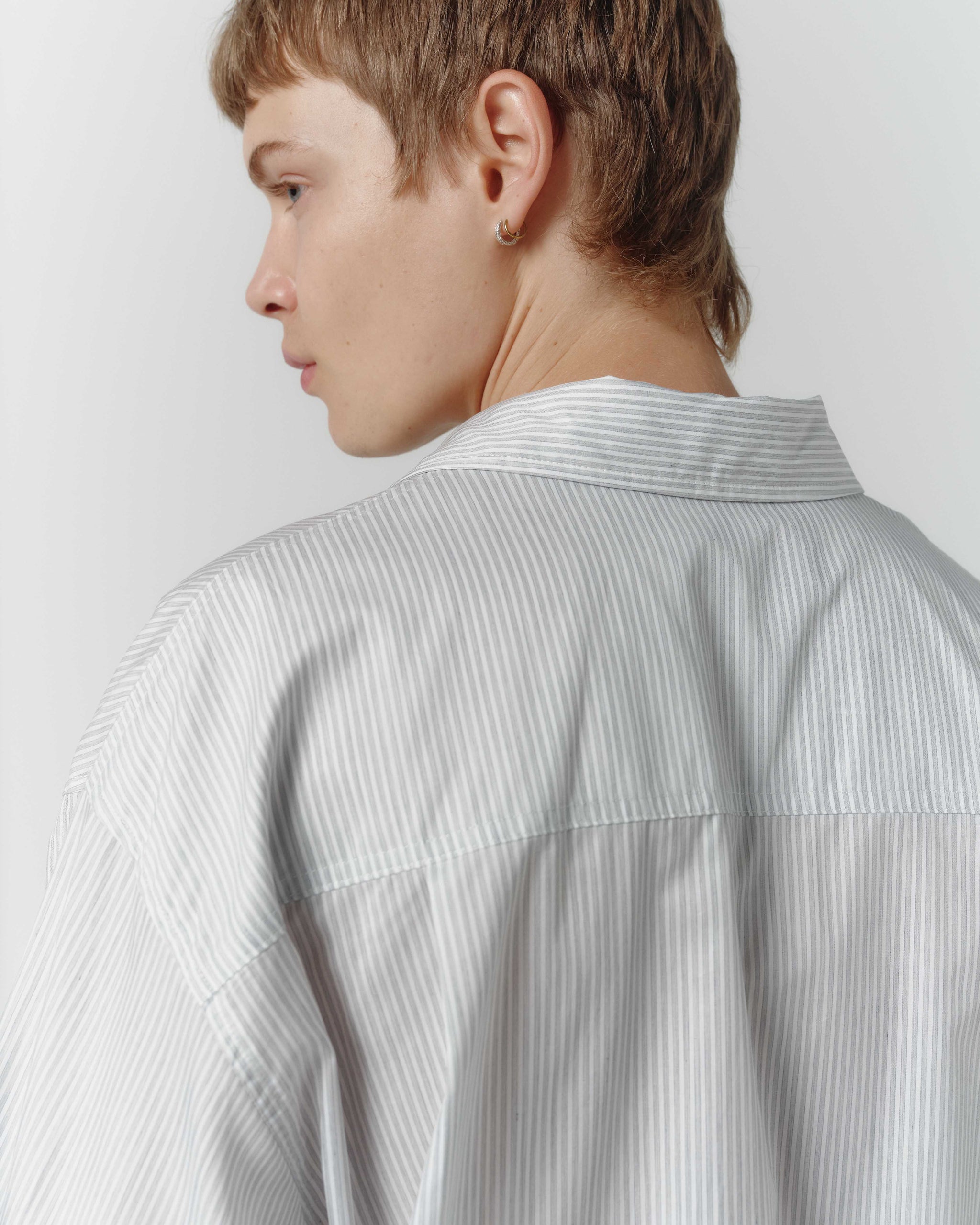 Our take on a classic business shirt. An overall loose fitting silhouette, designed to hang off the body, with drop shoulders and a curved, waistline finish. This iteration is cut from a lightweight, Italian cotton twill with a faded grey stripe.