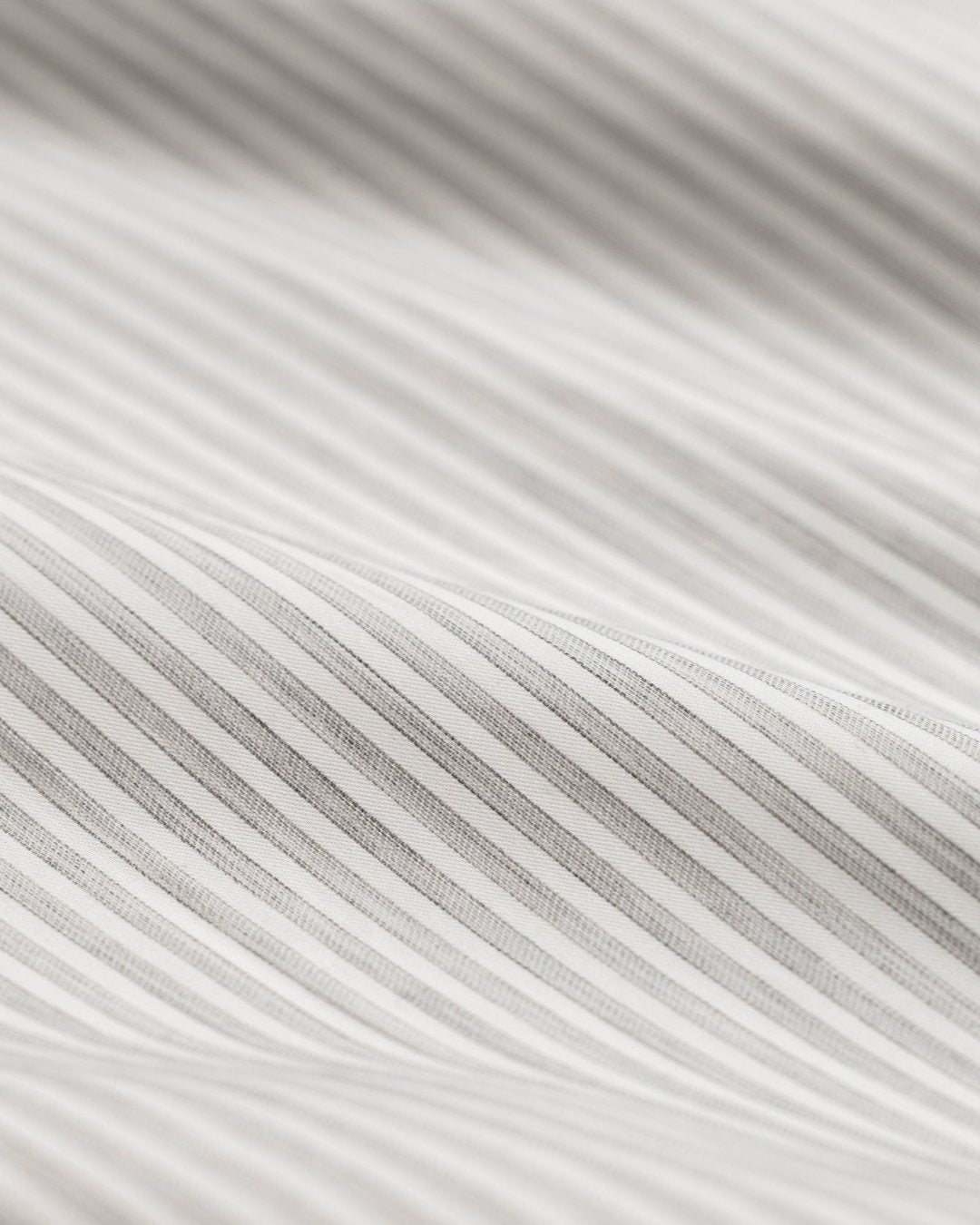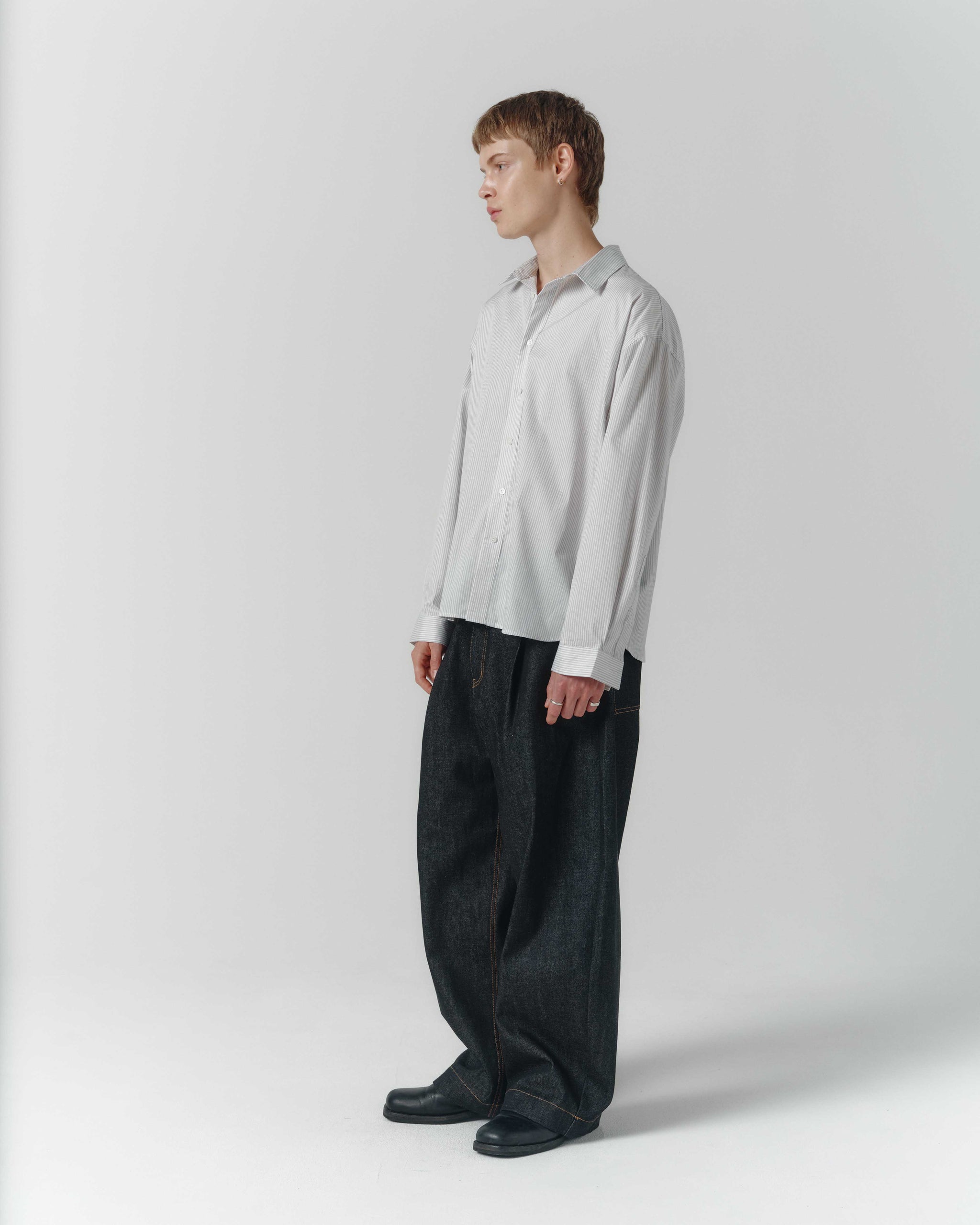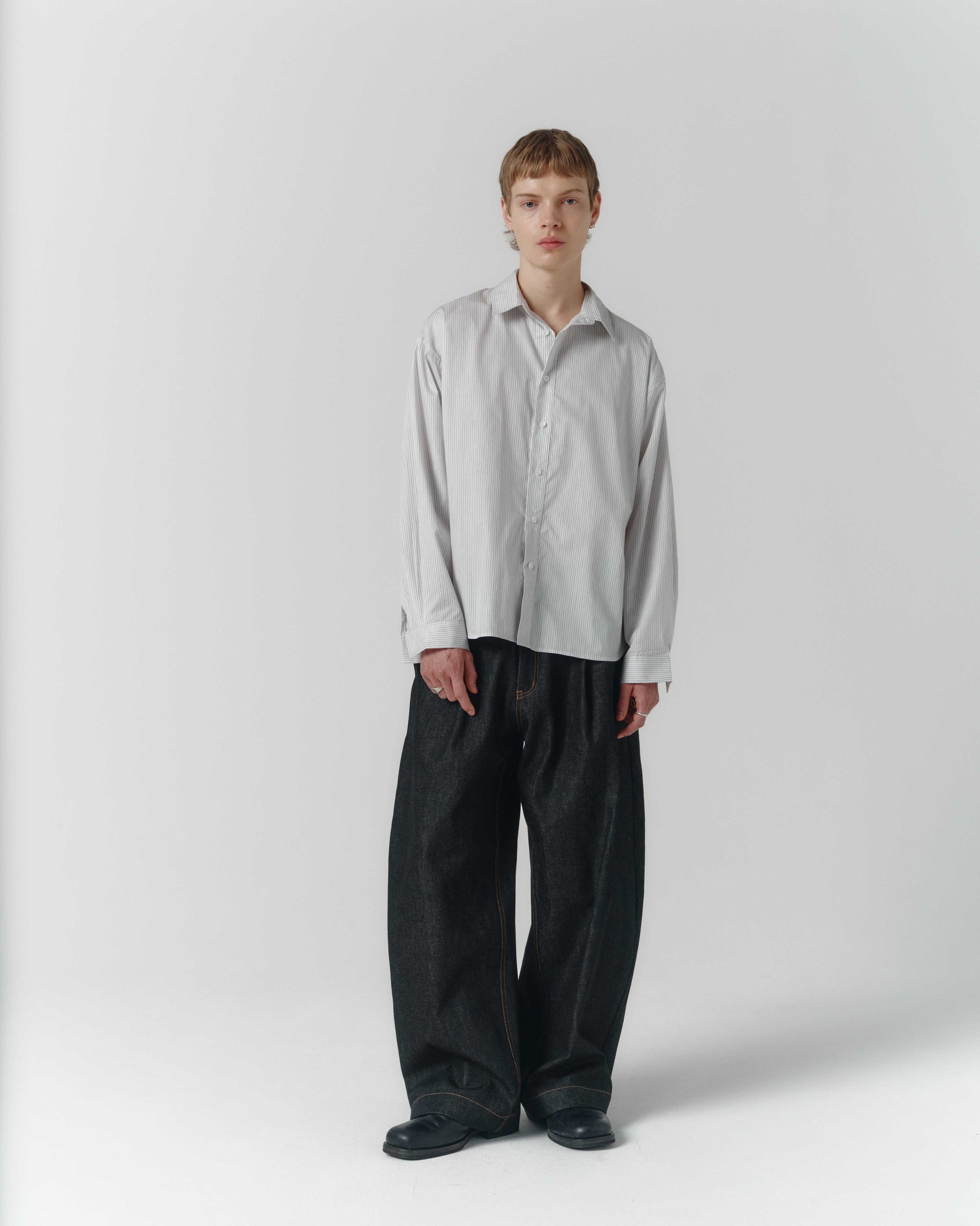 Our take on a classic business shirt. An overall loose fitting silhouette, designed to hang off the body, with drop shoulders and a curved, waistline finish. This iteration is cut from a lightweight, Italian cotton twill with a faded grey stripe.