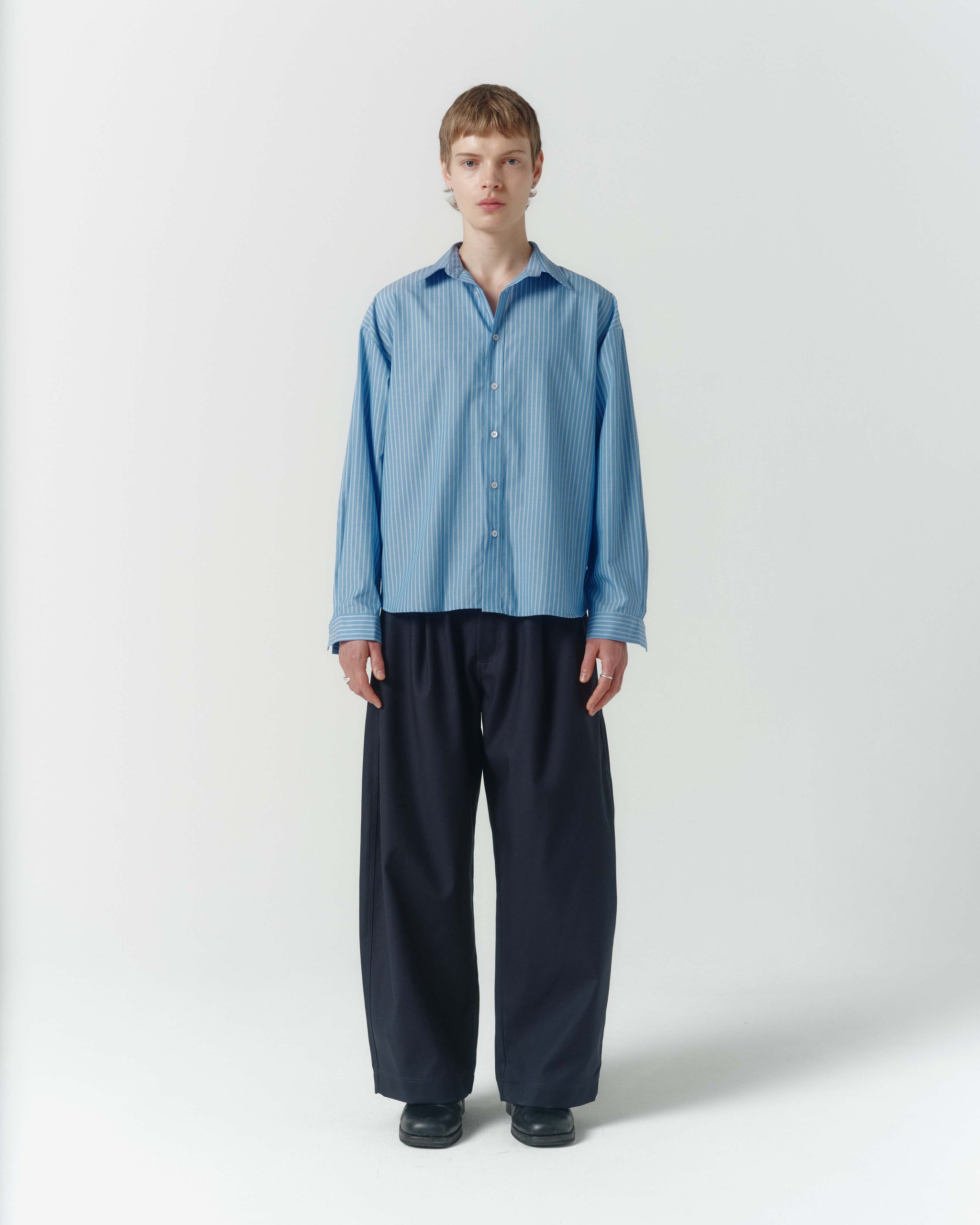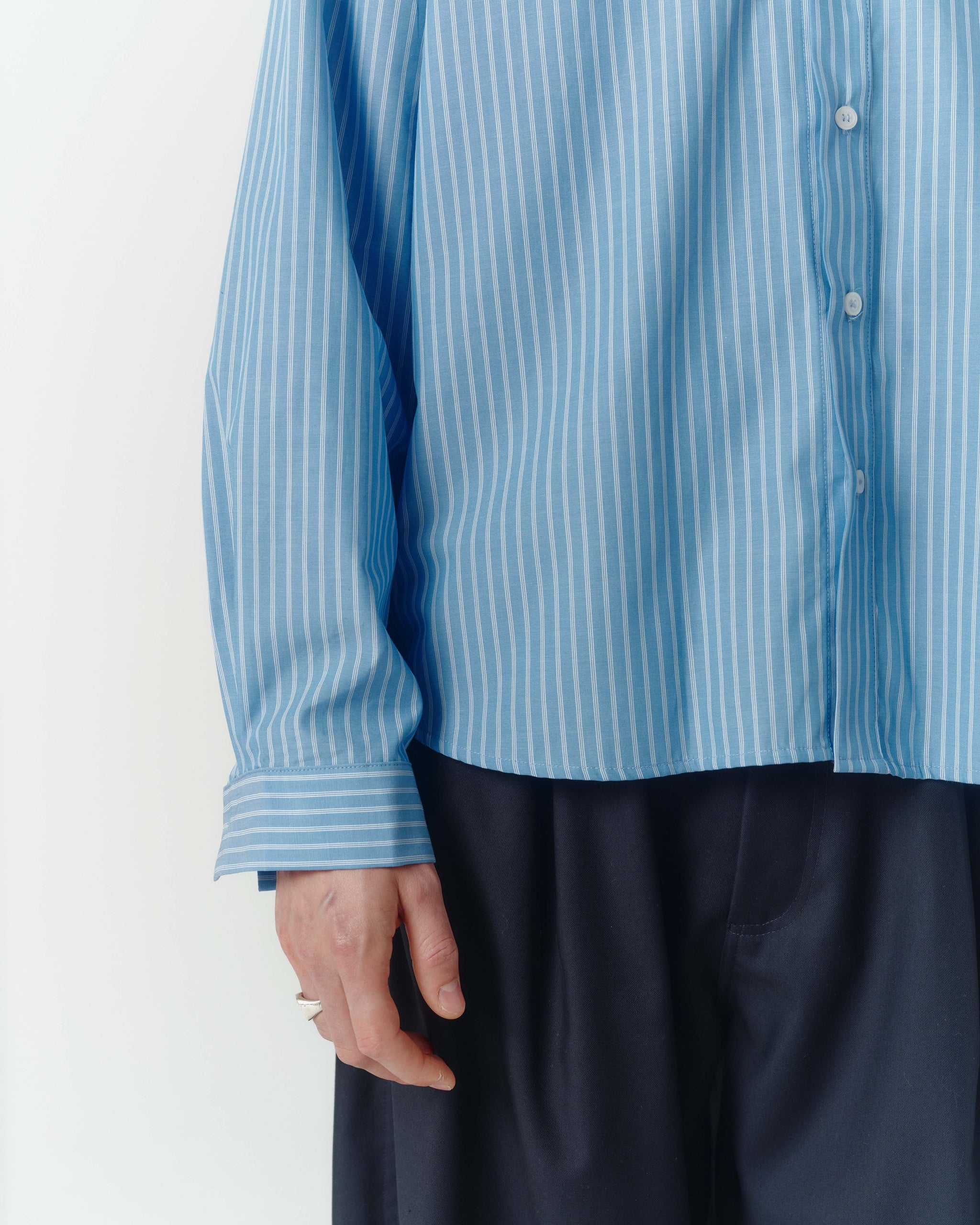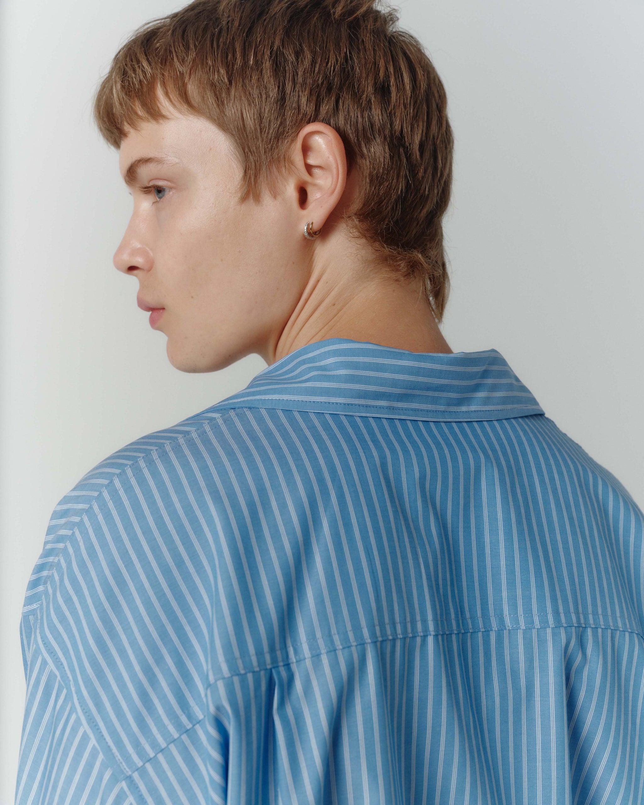 Our take on a classic business shirt. An overall loose fitting silhouette, designed to hang off the body, with drop shoulders and a curved, waistline finish. Cut from an Italian, blue cotton poplin, with three fine white stripes.