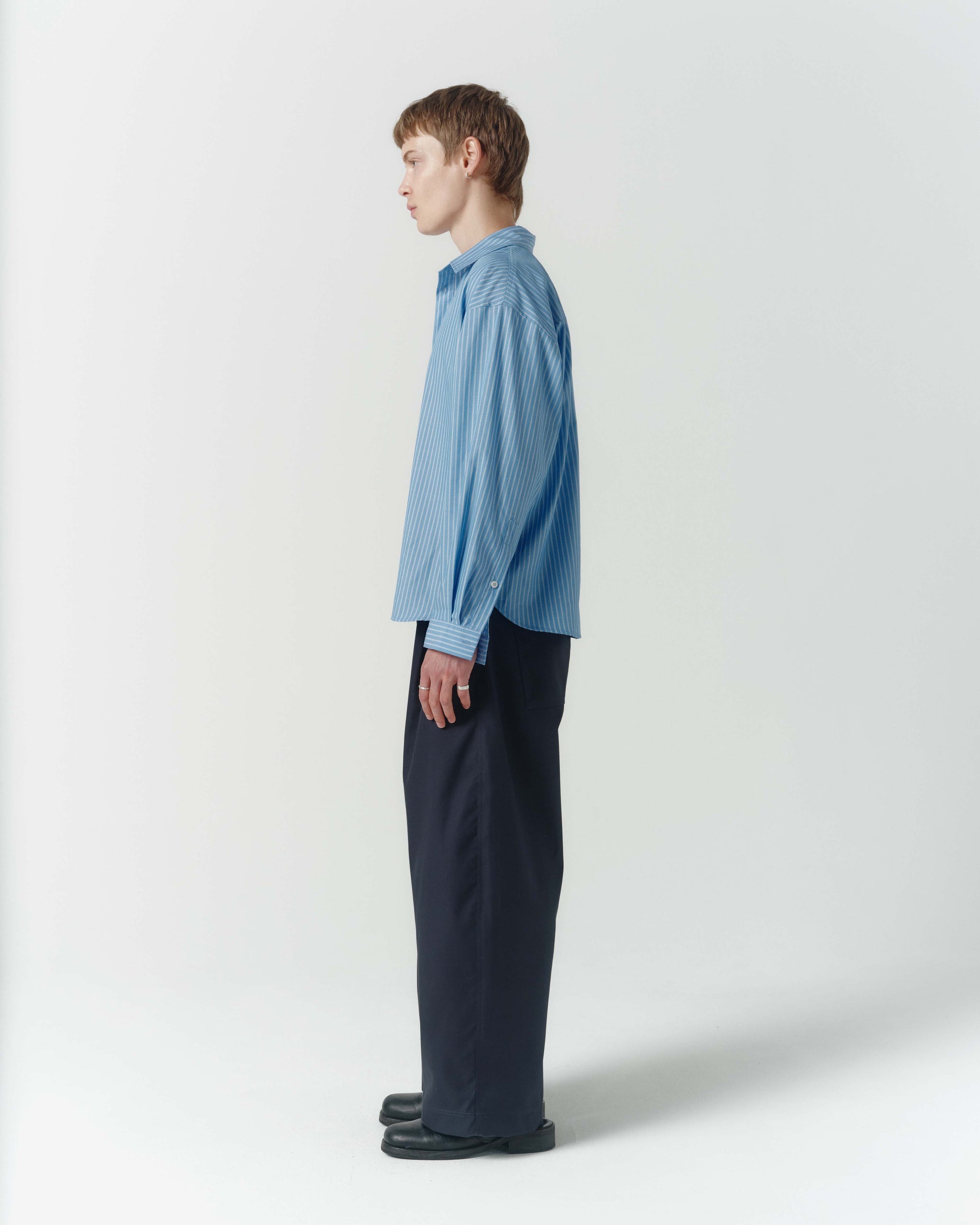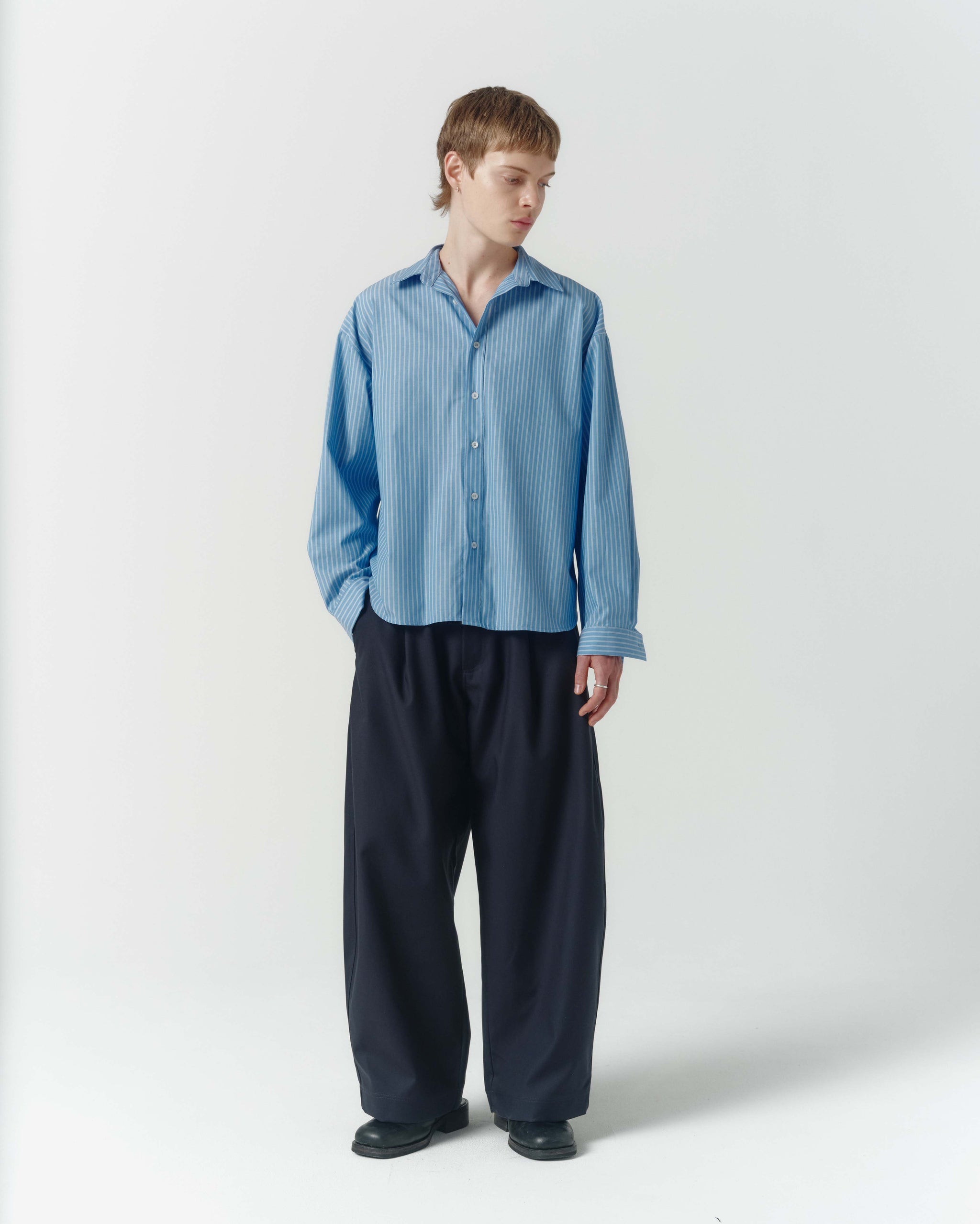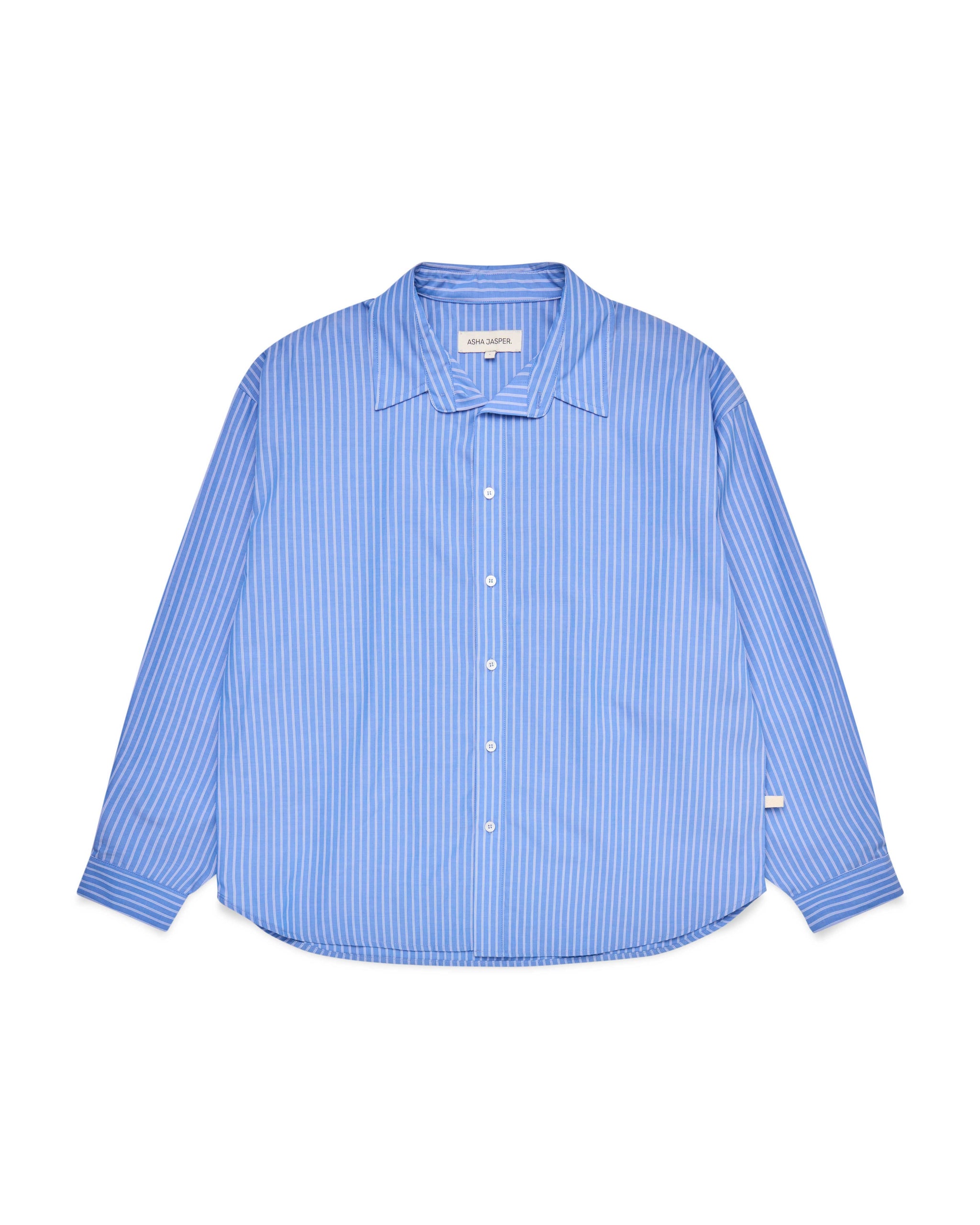 Our take on a classic business shirt. An overall loose fitting silhouette, designed to hang off the body, with drop shoulders and a curved, waistline finish. Cut from an Italian, blue cotton poplin, with three fine white stripes.