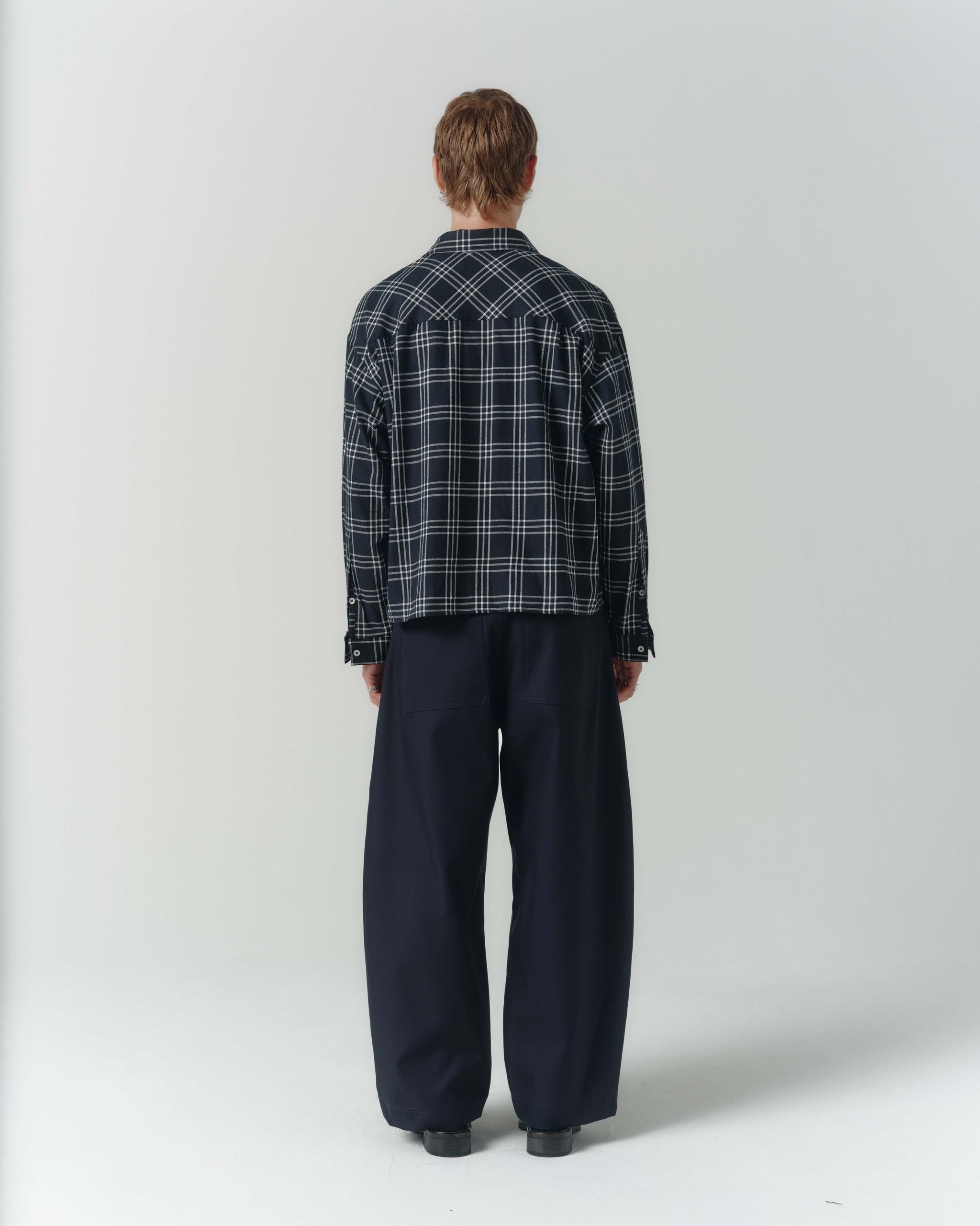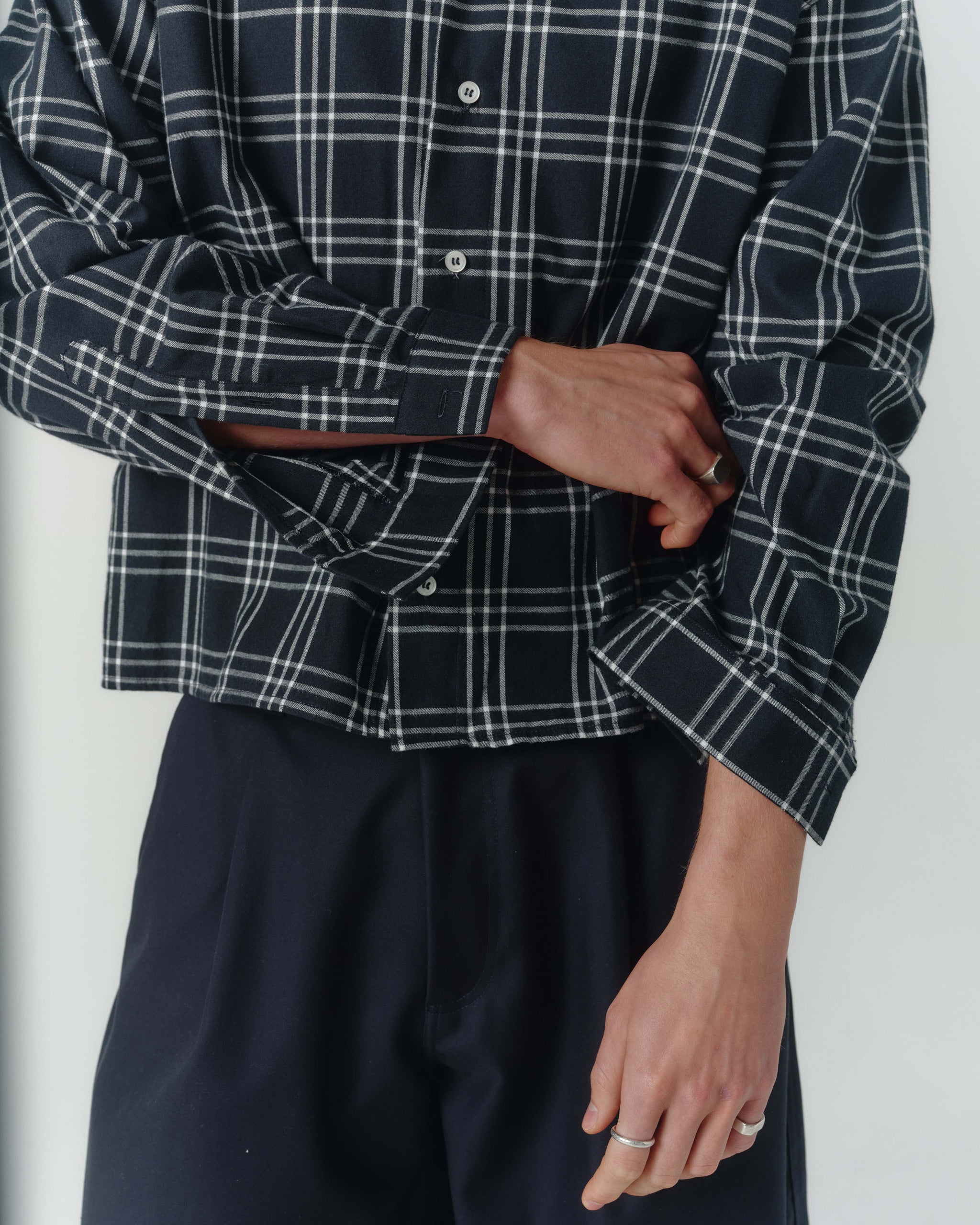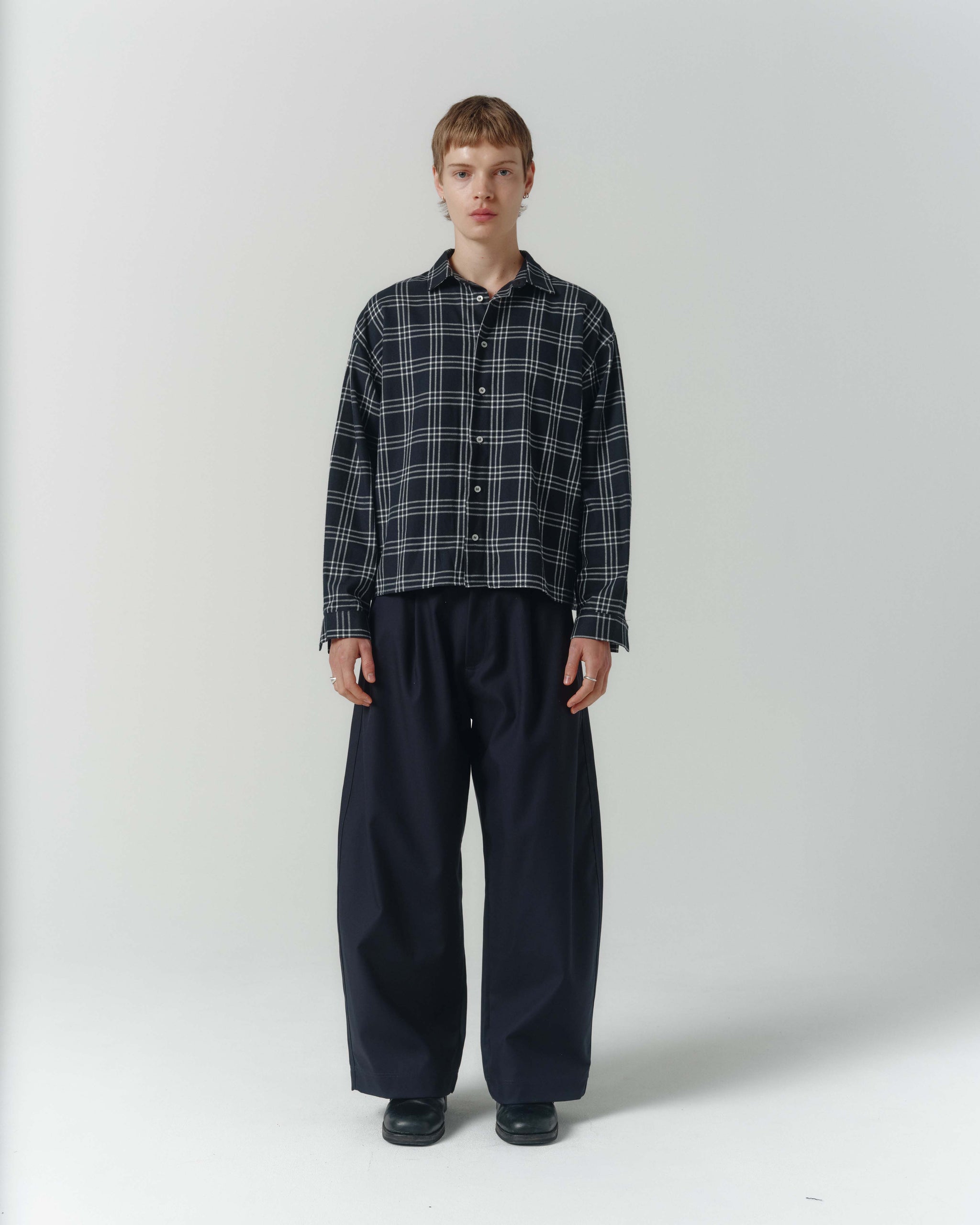 The Grid Shirt is a contemporary take on shirting. Designed with drop shoulders and a squared hemline that finishes at the waist for an overall loose fitting, boxy silhouette. Cut from a soft, black & white plaid cotton flannel.