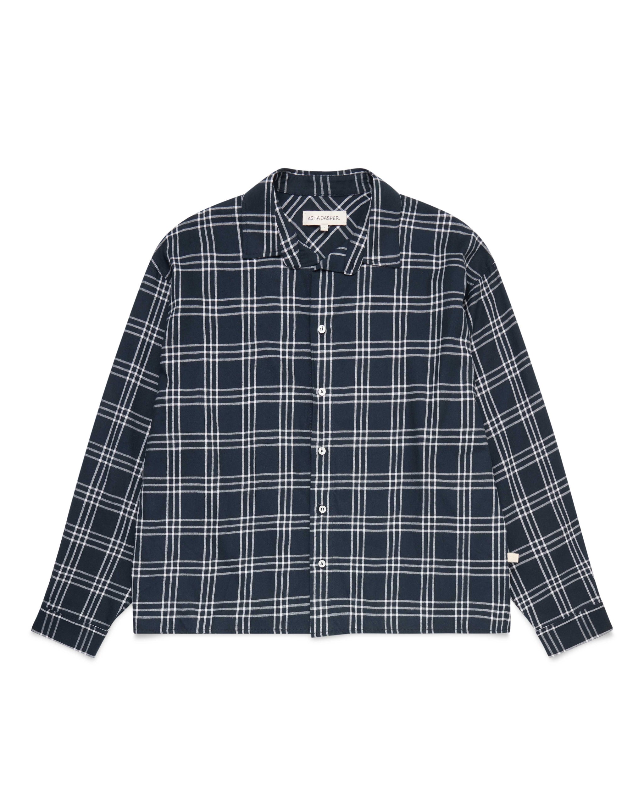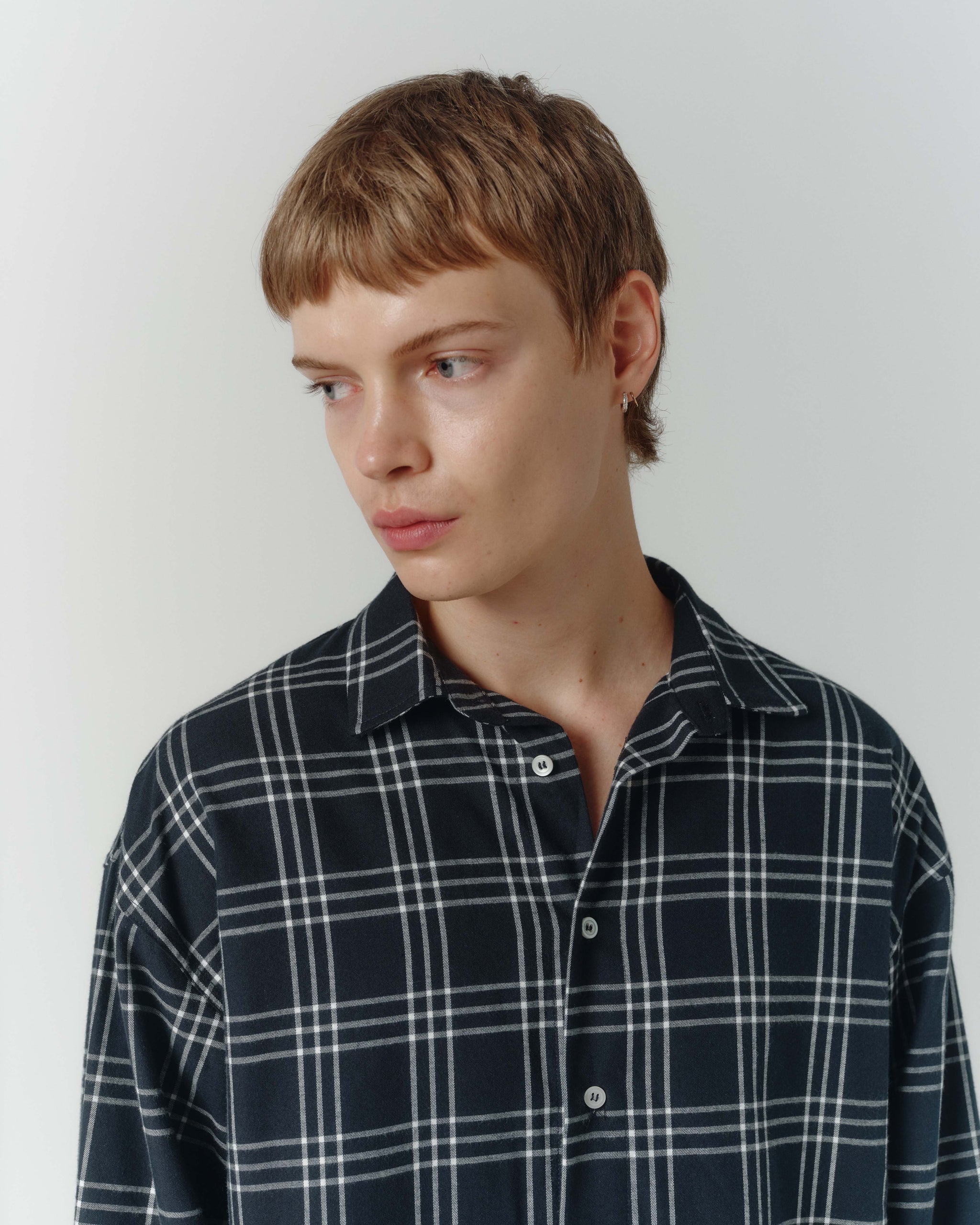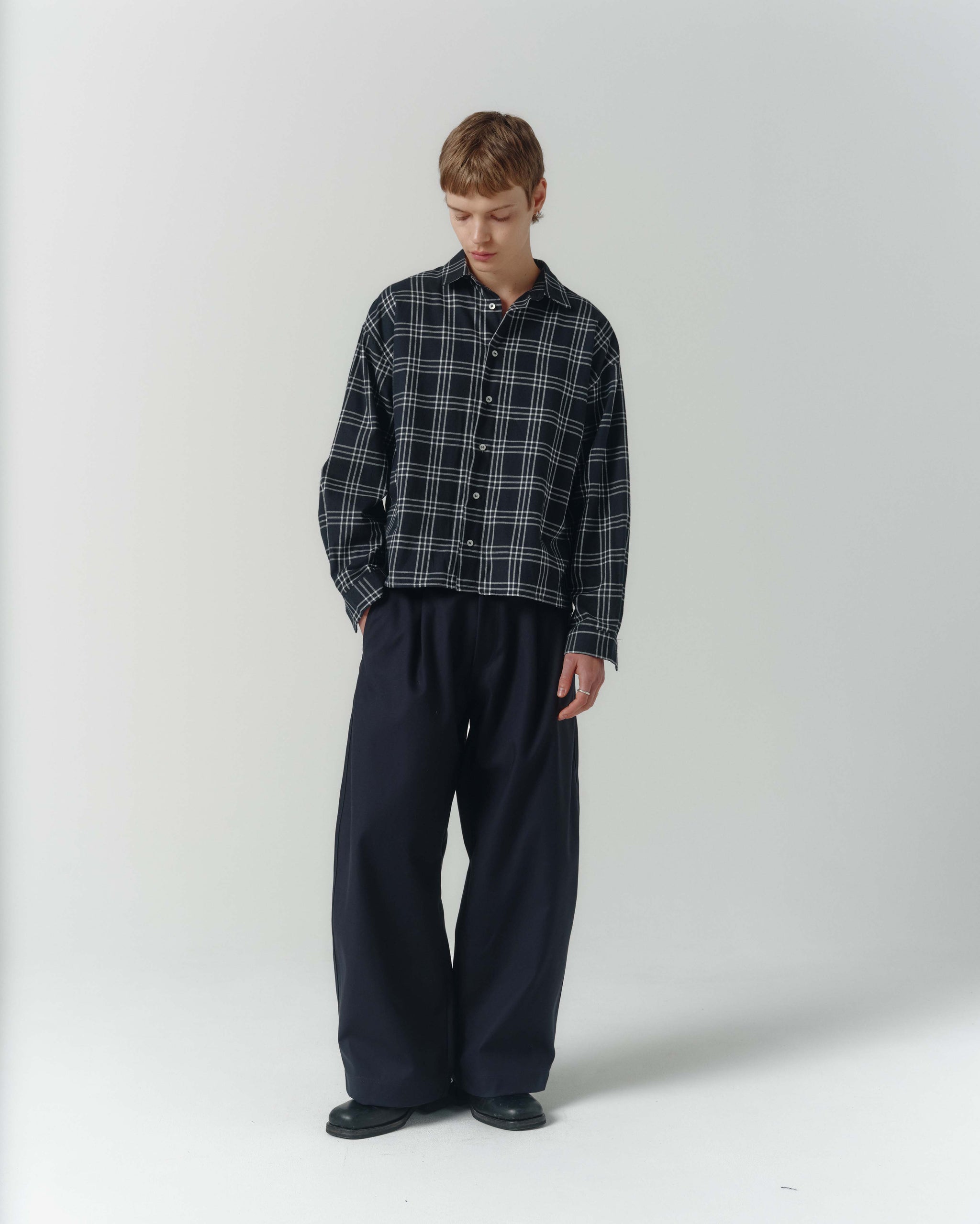 The Grid Shirt is a contemporary take on shirting. Designed with drop shoulders and a squared hemline that finishes at the waist for an overall loose fitting, boxy silhouette. Cut from a soft, black & white plaid cotton flannel.