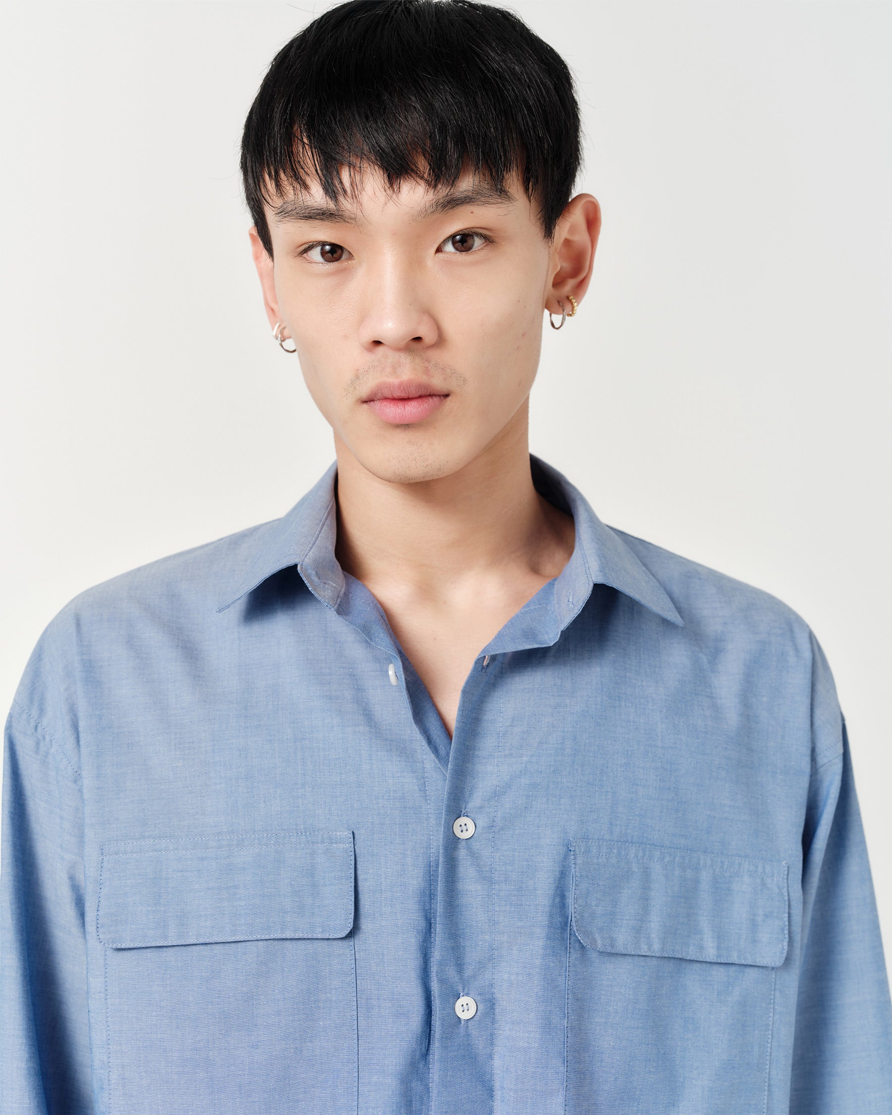 A modern interpretation of a classic workwear staple. Cut to a relaxed fit with drop shoulders and a curved hemline, designed to naturally drape off the body. Two oversized flap pockets anchor the front. Crafted from a lightweight cotton chambray.