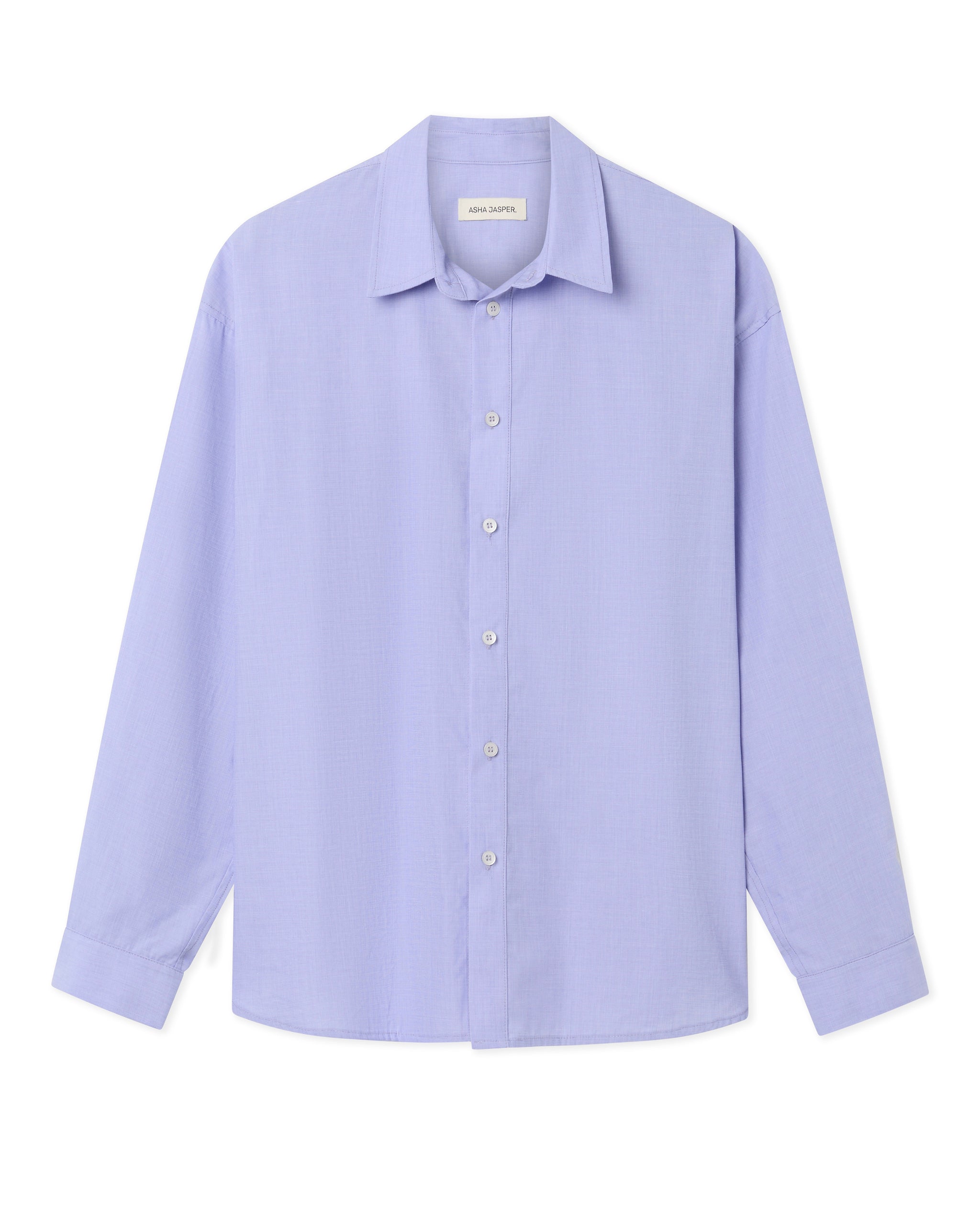 Our take on a classic business shirt. An overall loose fitting silhouette, designed to hang off the body, with drop shoulders and a curved hemline. This iteration is cut from a soft blue cotton fil-à-fil, chosen for its subtle texture and soft structure.