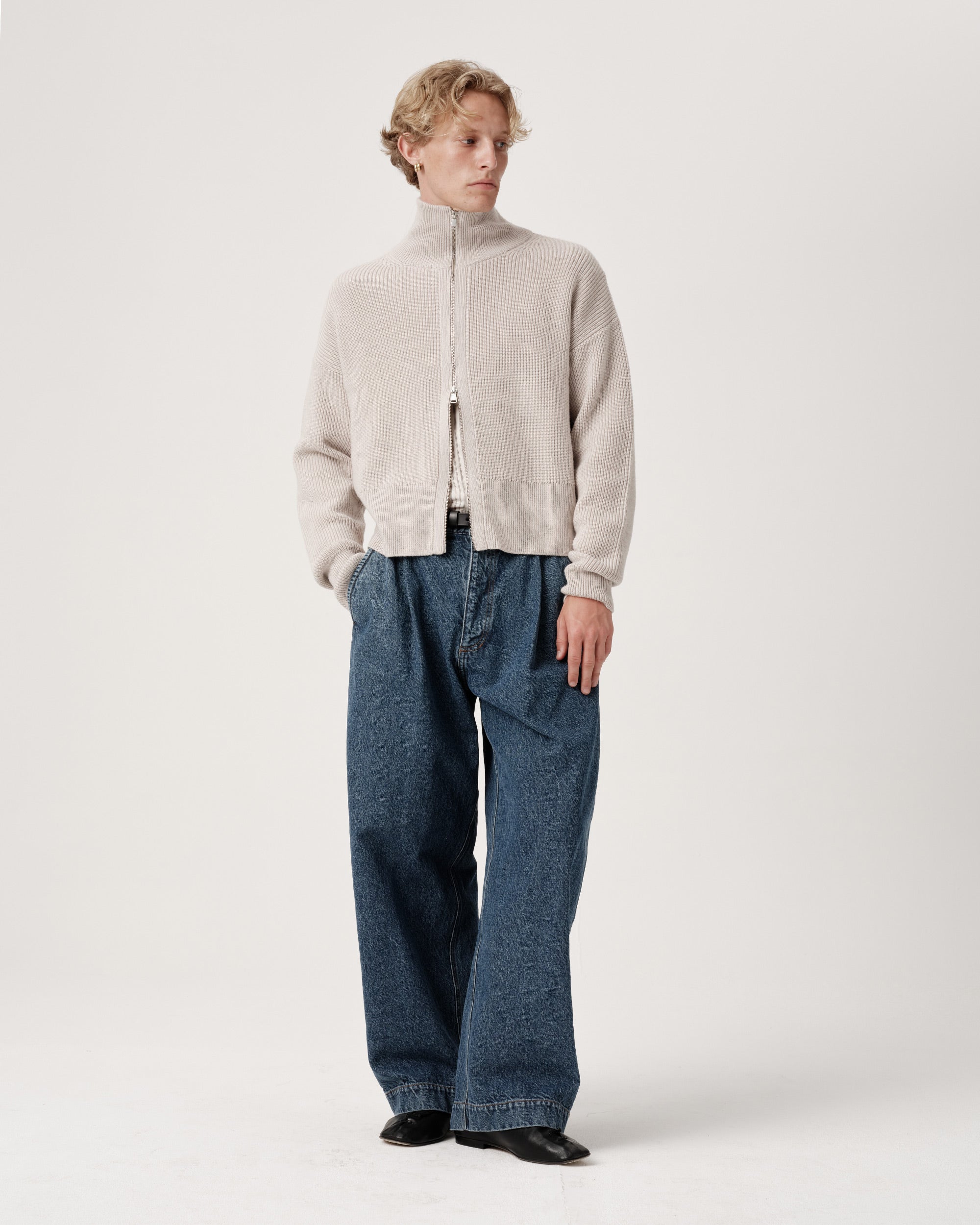 RWS-certified extrafine merino wool from South Africa, selected for its long-staple fibres that produce a soft, luxurious handle. Knitted in a 7-gauge half-cardigan construction for texture and volume.